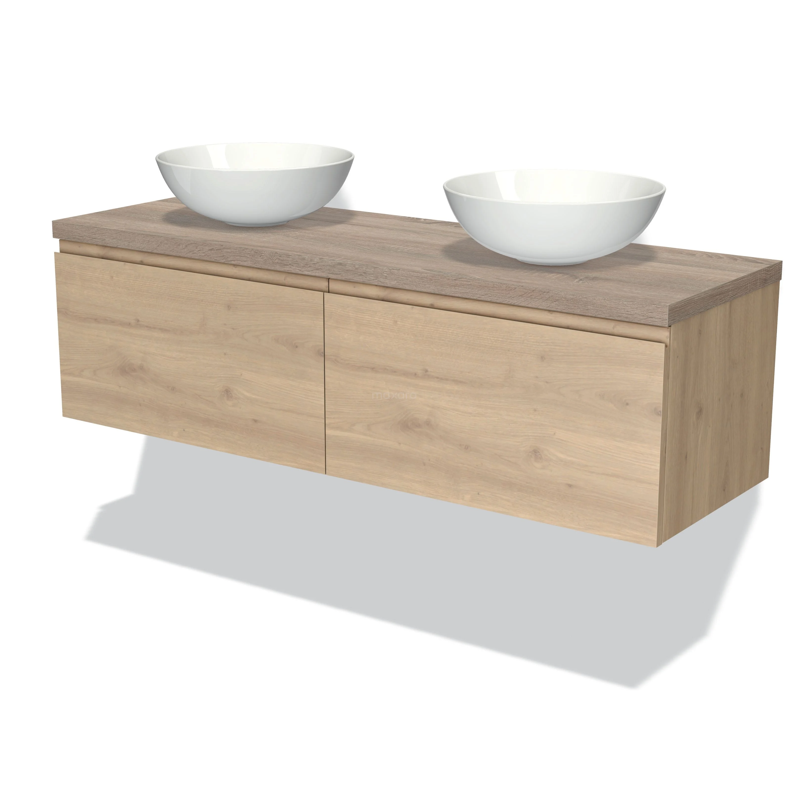 Modulo Plato Badmöbel mit Aufsatzwaschbecken | 140 cm Hellbraune Eiche Grifflos front Eiche blatt 2 nebeneinanderliegende Schubladen