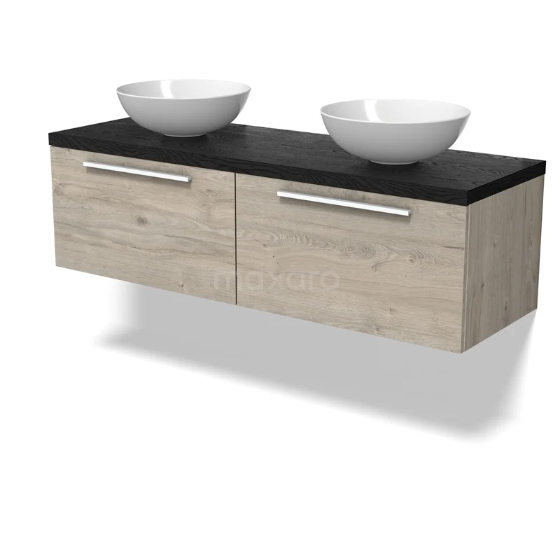 Modulo Plato Badmöbel mit Aufsatzwaschbecken | 140 cm Hellgraue Eiche Flach front Schwarze Eiche blatt 2 nebeneinanderliegende Schubladen