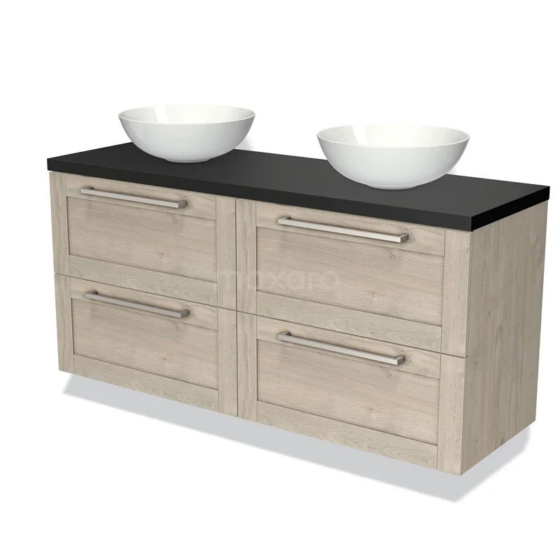 Modulo Plato Badmöbel mit Aufsatzwaschbecken | 140 cm Hellgraue Eiche Rahmen front Matt Schwarz blatt 4 Schubladen