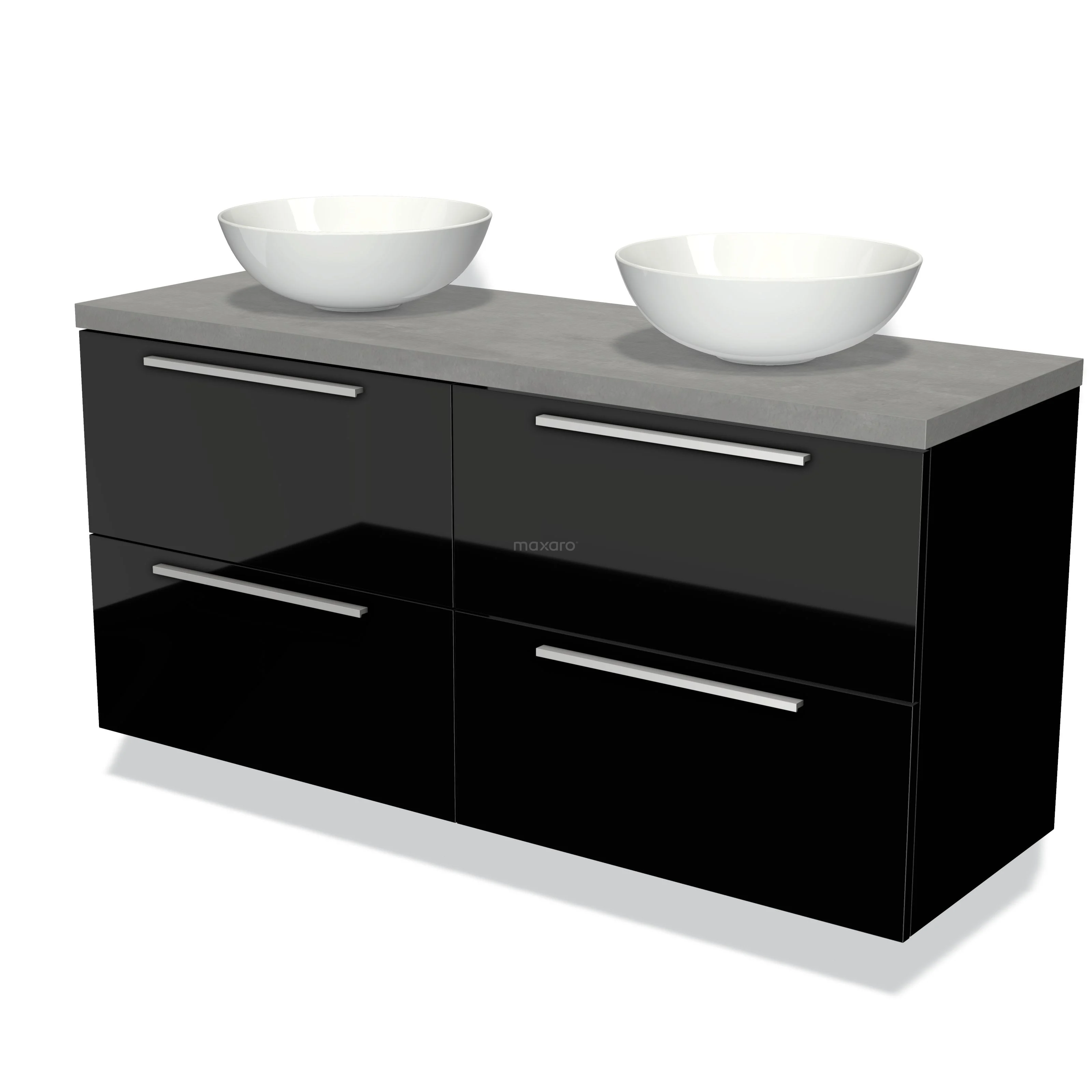Modulo Plato Badmöbel mit Aufsatzwaschbecken | 140 cm Hochglanz Schwarz Flach front Hellgrauer Beton blatt 4 Schubladen