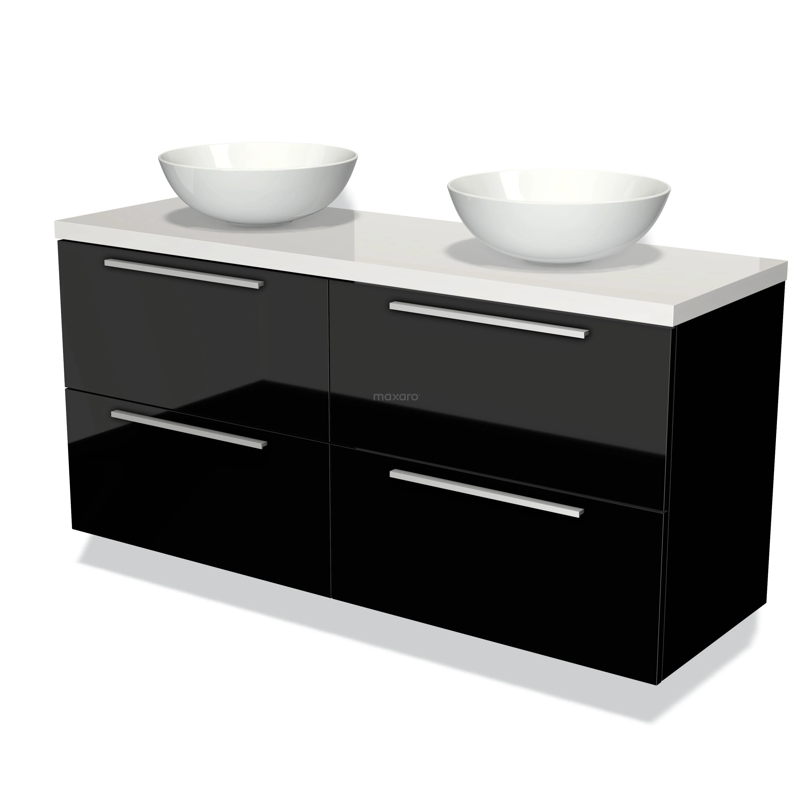 Modulo Plato Badmöbel mit Aufsatzwaschbecken | 140 cm Hochglanz Schwarz Flach front Hochglanz Weiß blatt 4 Schubladen
