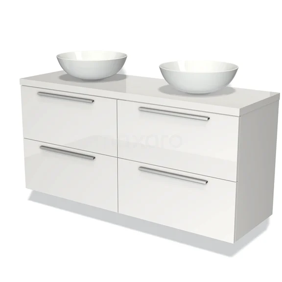 Modulo Plato Badmöbel mit Aufsatzwaschbecken | 140 cm Hochglanz Weiß Flach front Hochglanz Weiß blatt 4 Schubladen