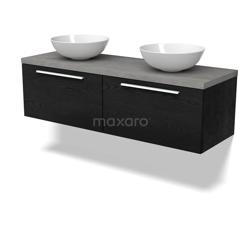 Modulo Plato Badmöbel mit Aufsatzwaschbecken | 140 cm Schwarze Eiche Flach front Hellgrauer Beton blatt 2 nebeneinanderliegende Schubladen