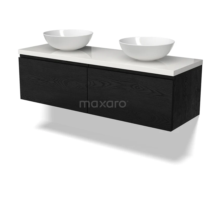 Modulo Plato Badmöbel mit Aufsatzwaschbecken | 140 cm Schwarze Eiche Grifflos front Hochglanz Weiß blatt 2 nebeneinanderliegende Schubladen