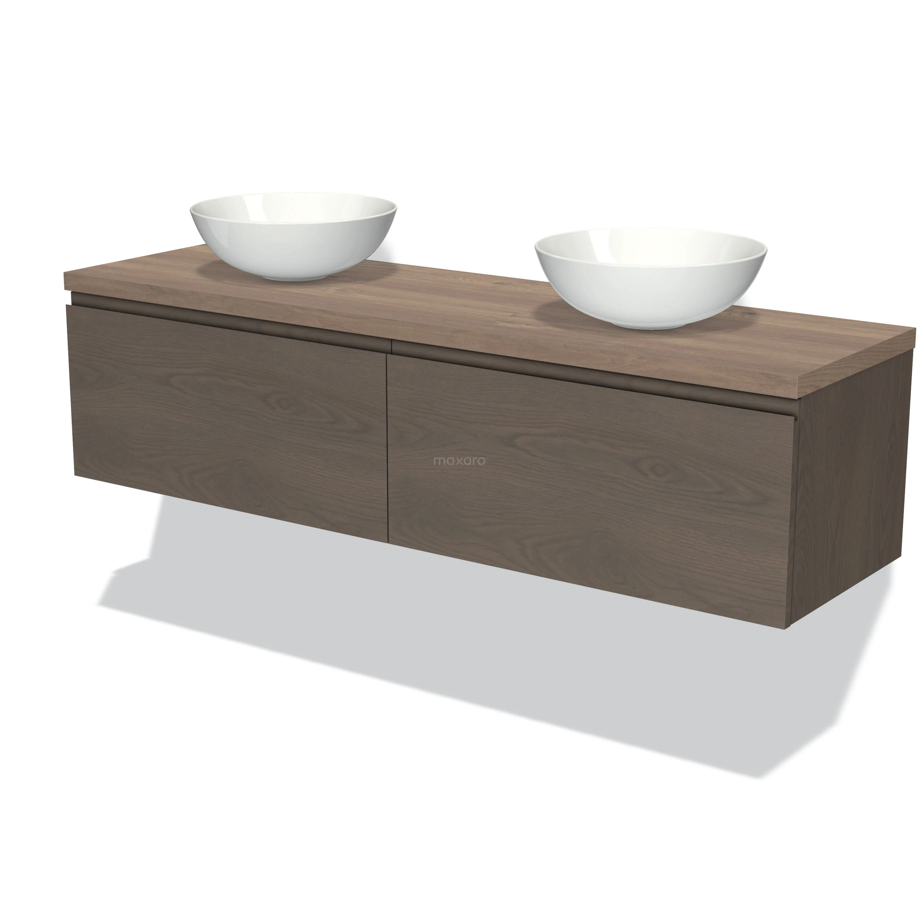 Modulo Plato Badmöbel mit Aufsatzwaschbecken | 160 cm Dunkelbraune Eiche Grifflos front Mittelbraune Eiche blatt 2 nebeneinanderliegende Schubladen
