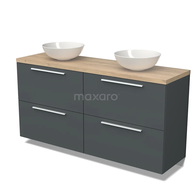 Modulo Plato Badmöbel mit Aufsatzwaschbecken | 160 cm Dunkelgrau Flach front Hellbraune Eiche blatt 4 hohe Schubladen