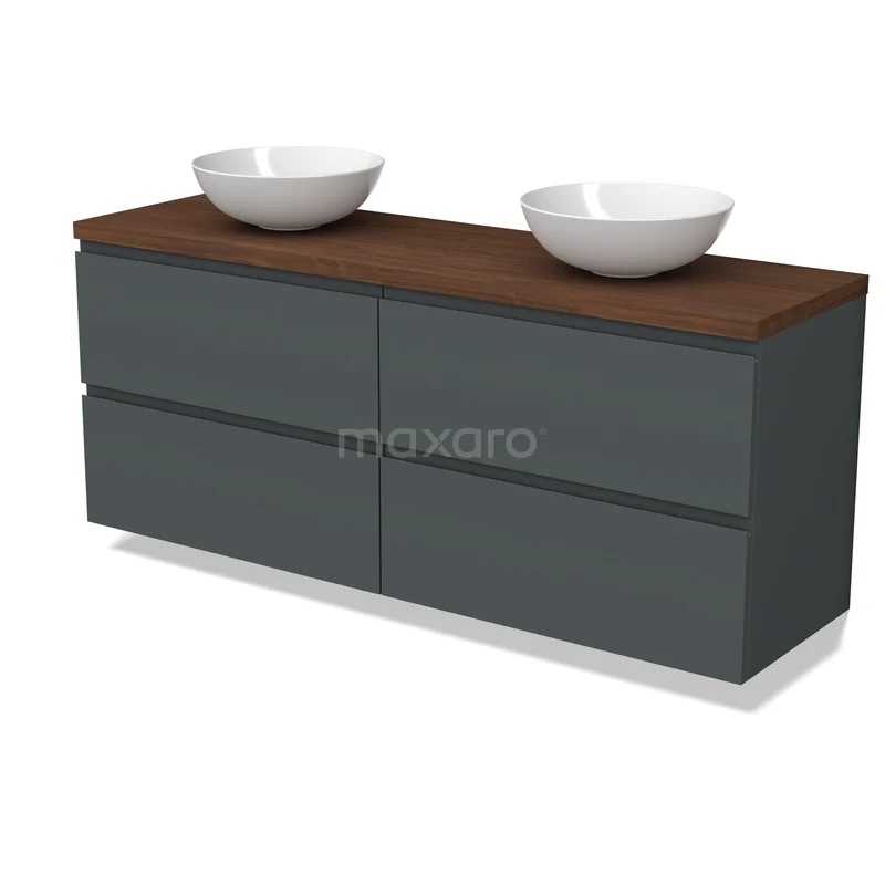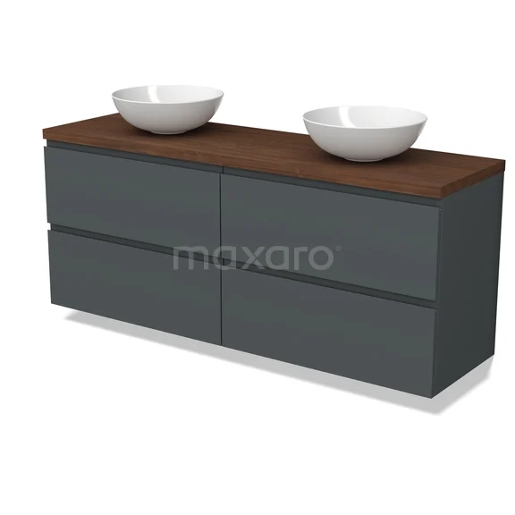 Modulo Plato Badmöbel mit Aufsatzwaschbecken | 160 cm Dunkelgrau Grifflos front Walnuss blatt 4 Schubladen
