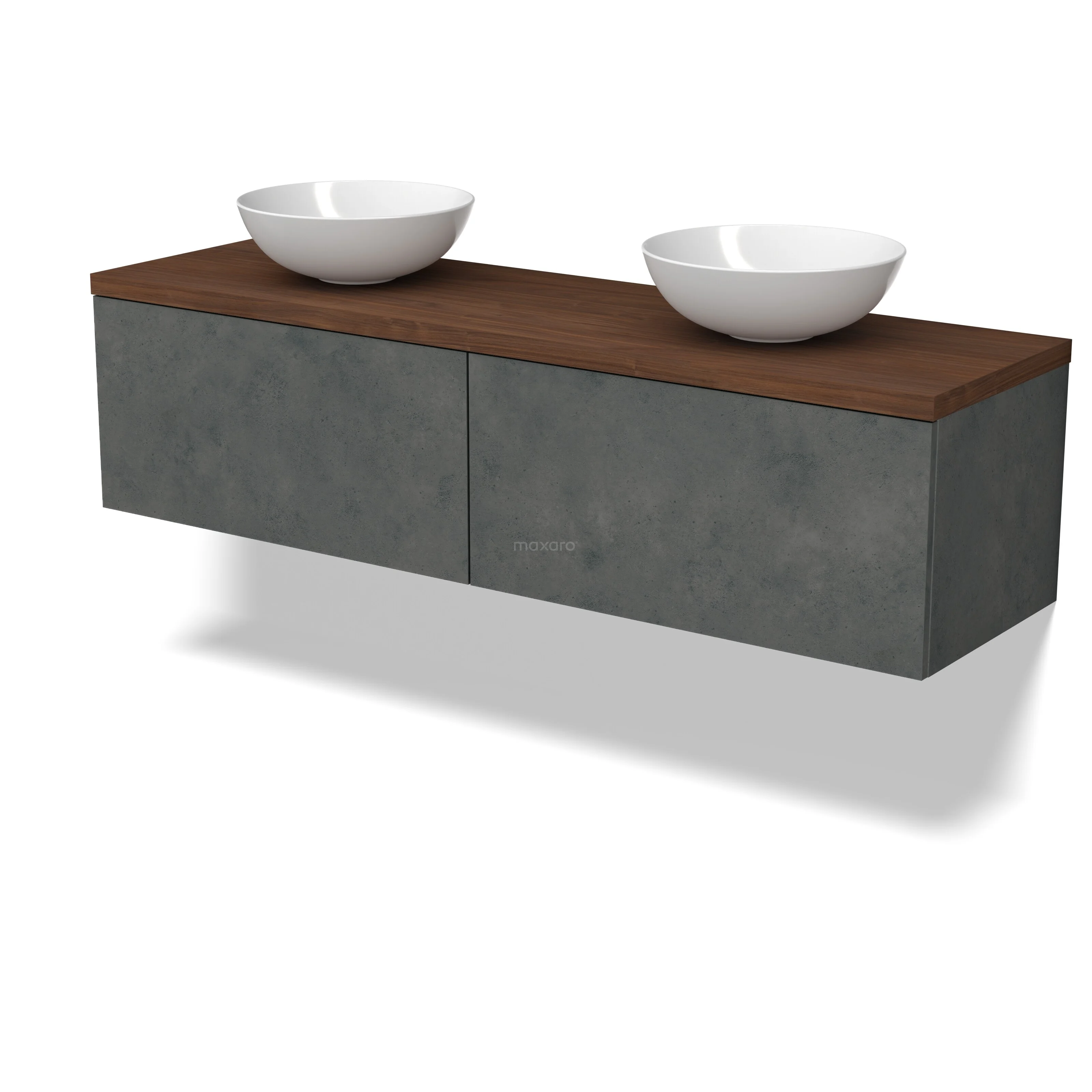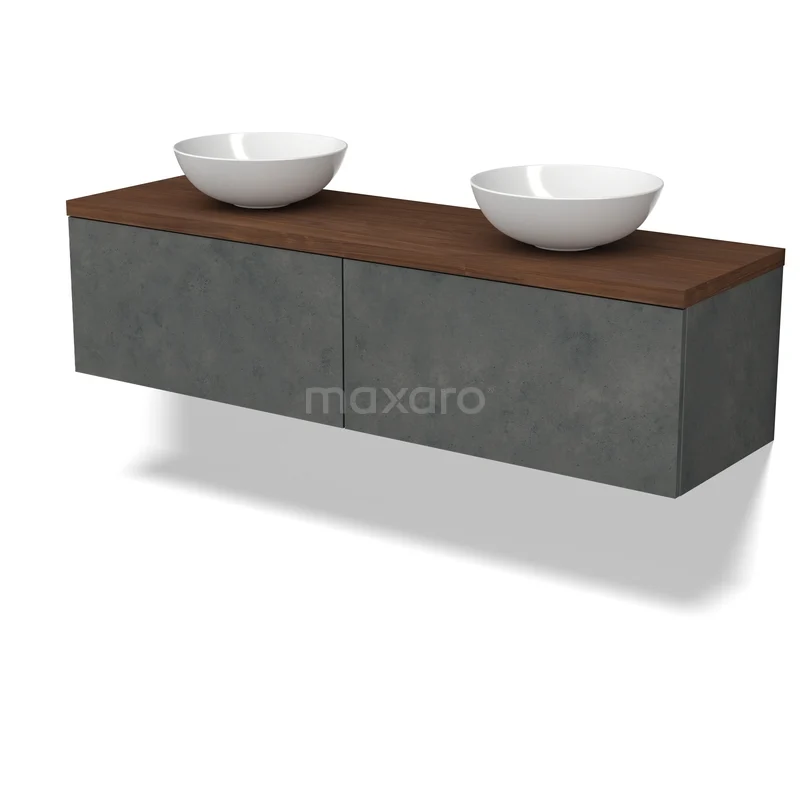 Modulo Plato Badmöbel mit Aufsatzwaschbecken | 160 cm Dunkelgrauer Beton Flach front Walnuss blatt 2 nebeneinanderliegende Schubladen
