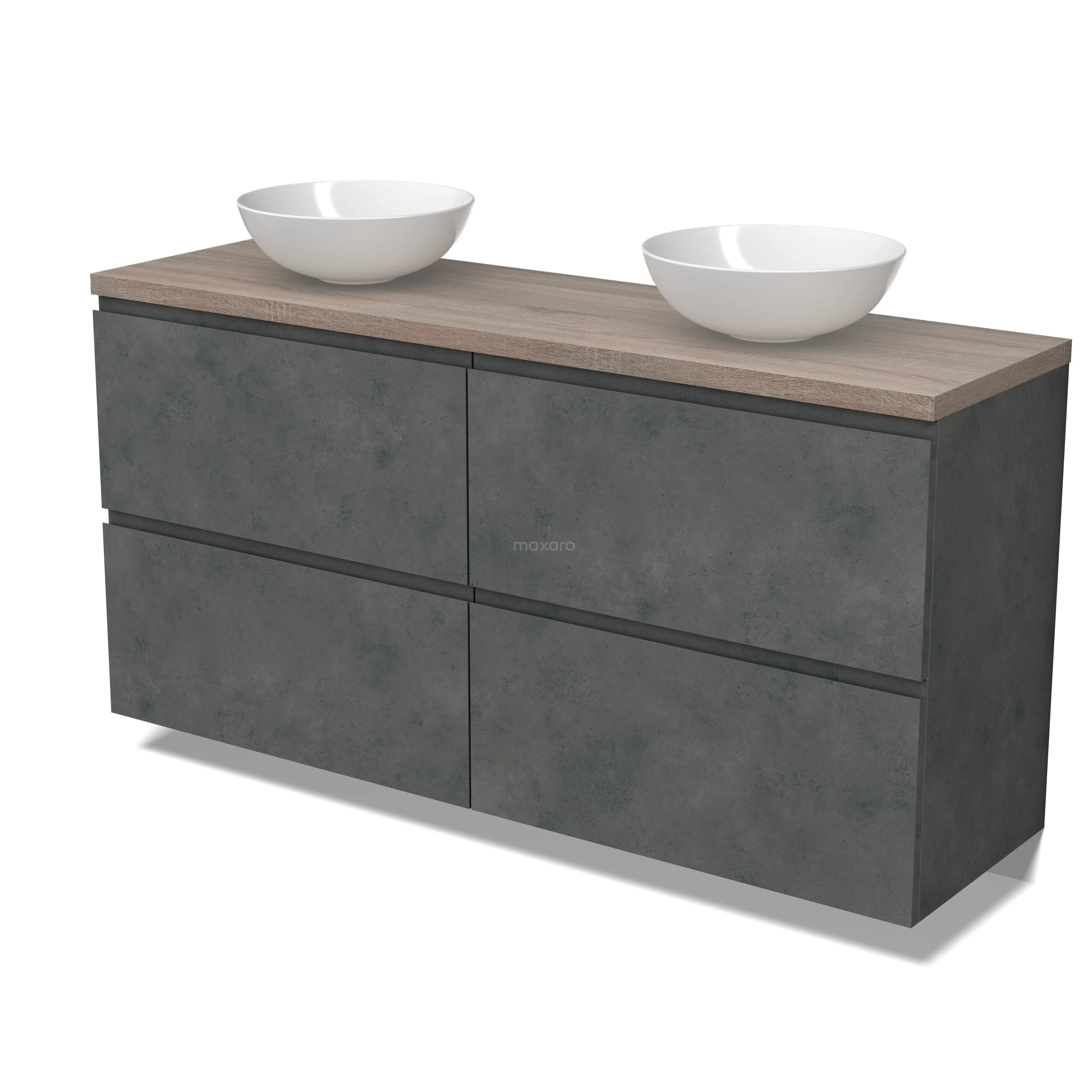 Modulo Plato Badmöbel mit Aufsatzwaschbecken | 160 cm Dunkelgrauer Beton Grifflos front Eiche blatt 4 hohe Schubladen