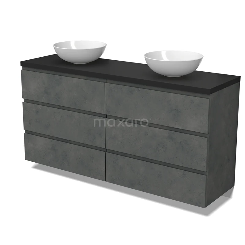 Modulo Plato Badmöbel mit Aufsatzwaschbecken | 160 cm Dunkelgrauer Beton Grifflos front Matt Schwarz blatt 6 Schubladen