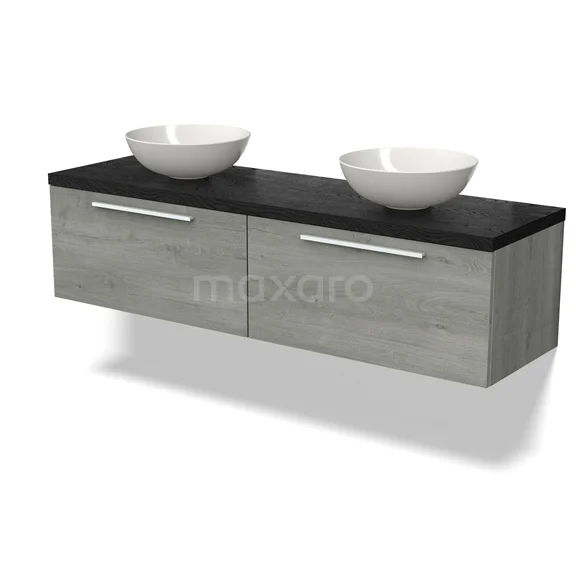 Modulo Plato Badmöbel mit Aufsatzwaschbecken | 160 cm Graue Eiche Flach front Schwarze Eiche blatt 2 nebeneinanderliegende Schubladen