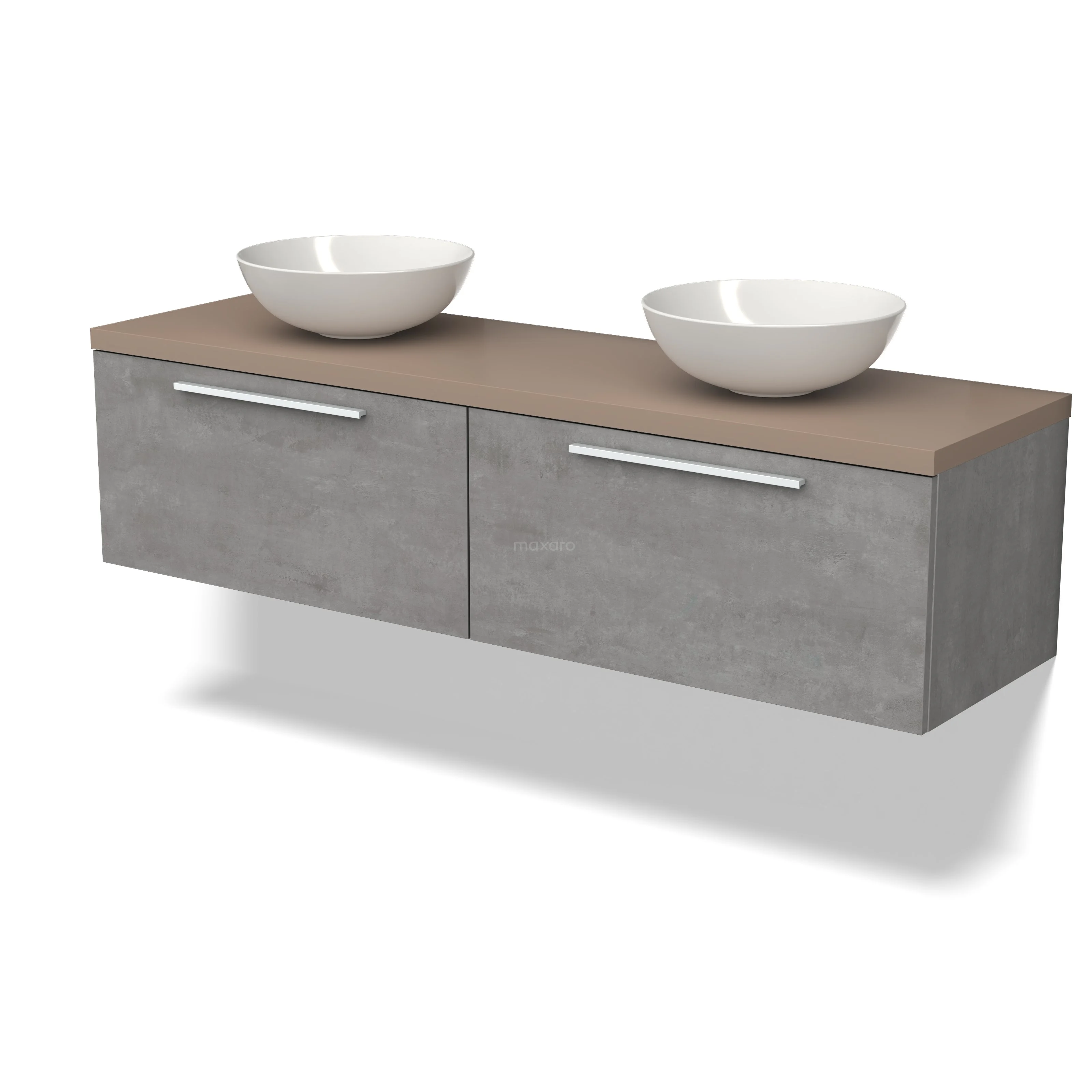 Modulo Plato Badmöbel mit Aufsatzwaschbecken | 160 cm Hellgrauer Beton Flach front Taupe blatt 2 nebeneinanderliegende Schubladen