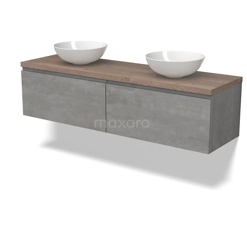 Modulo Plato Badmöbel mit Aufsatzwaschbecken | 160 cm Hellgrauer Beton Grifflos front Mittelbraune Eiche blatt 2 nebeneinanderliegende Schubladen