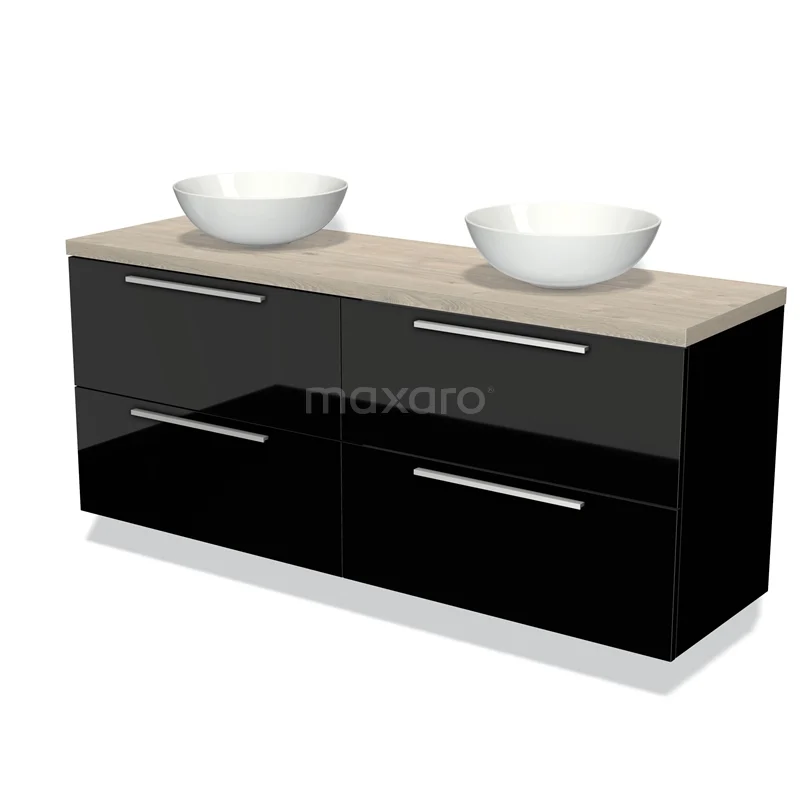 Modulo Plato Badmöbel mit Aufsatzwaschbecken | 160 cm Hochglanz Schwarz Flach front Hellgraue Eiche blatt 4 Schubladen