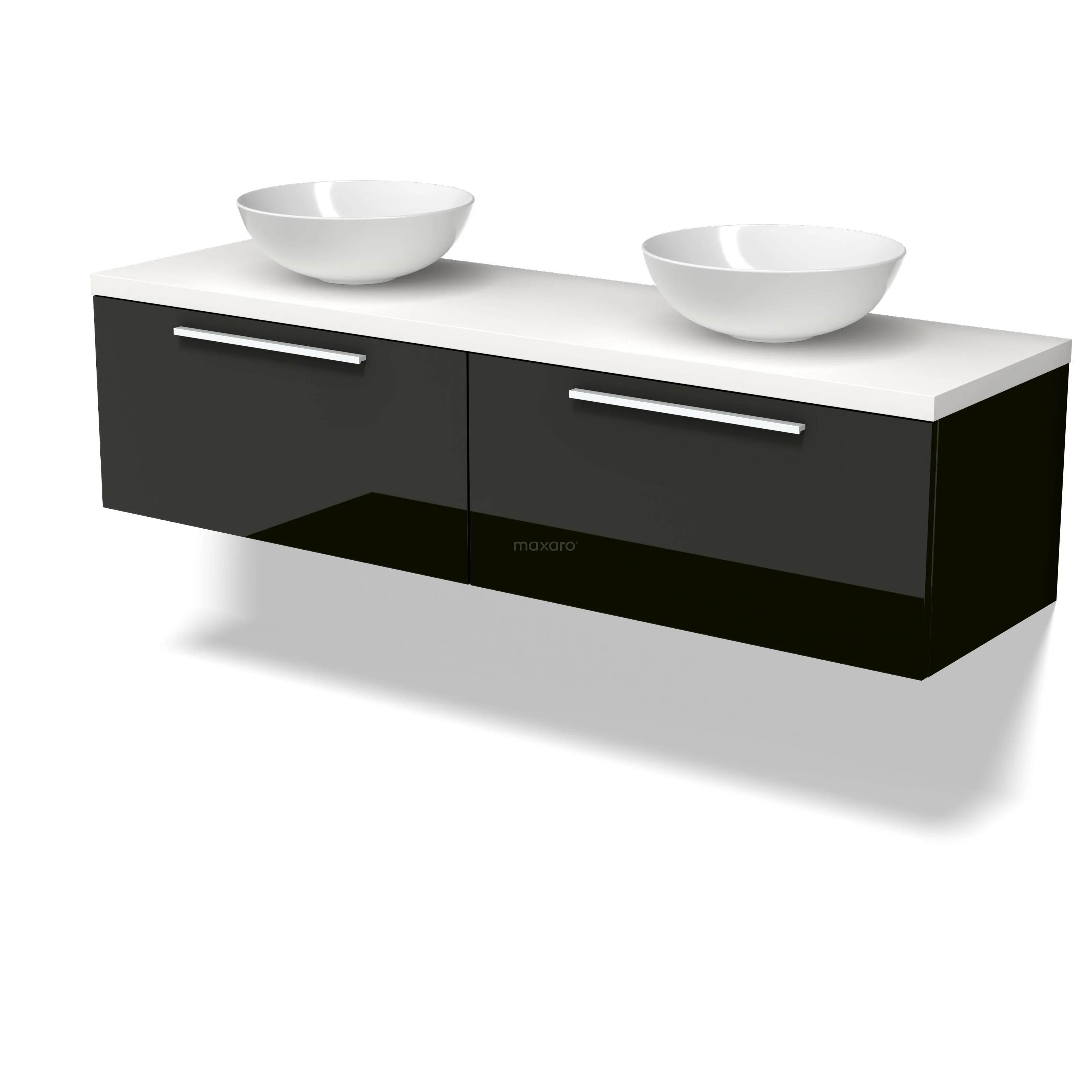 Modulo Plato Badmöbel mit Aufsatzwaschbecken | 160 cm Hochglanz Schwarz Flach front Matt Weiß blatt 2 nebeneinanderliegende Schubladen