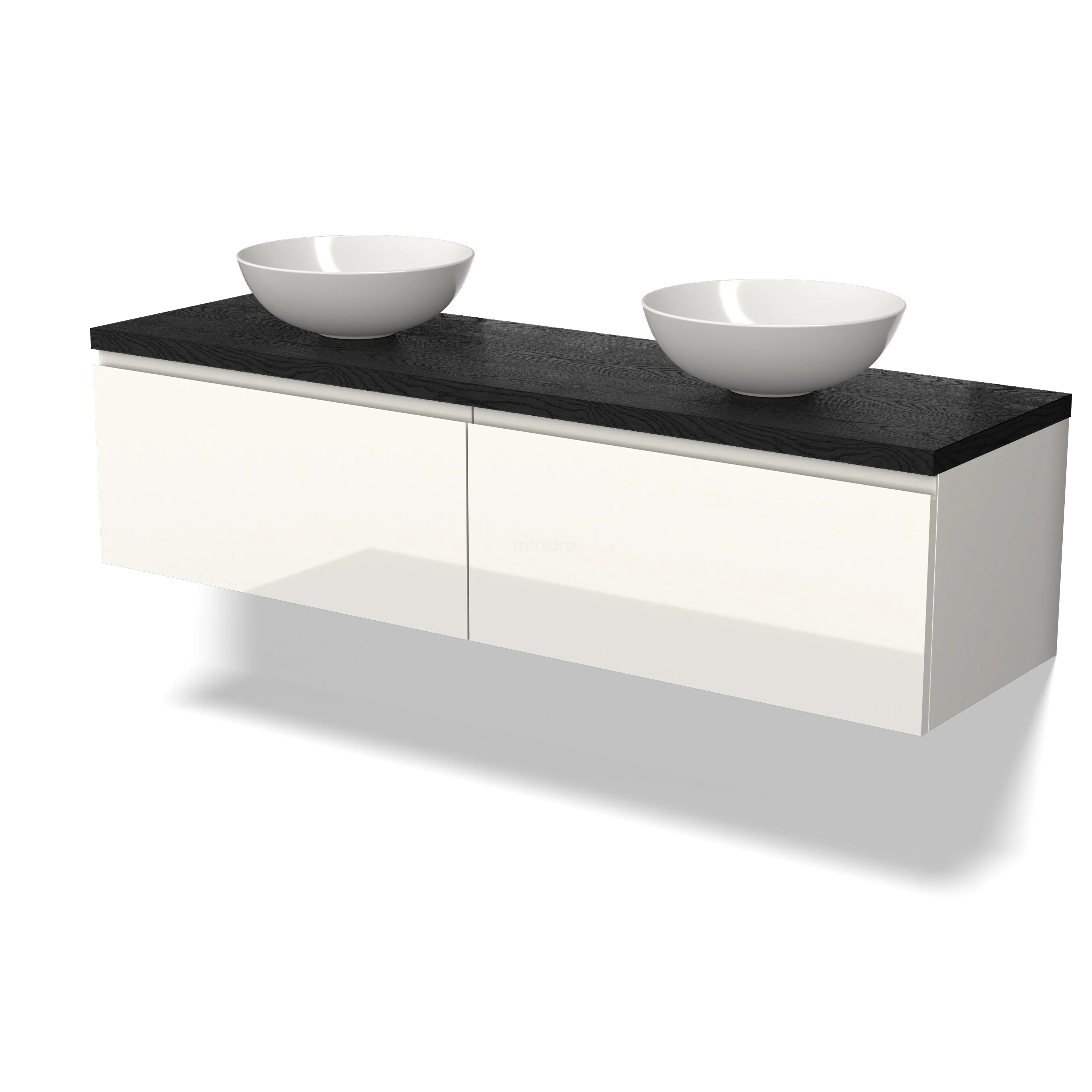 Modulo Plato Badmöbel mit Aufsatzwaschbecken | 160 cm Hochglanz Weiß Grifflos front Schwarze Eiche blatt 2 nebeneinanderliegende Schubladen