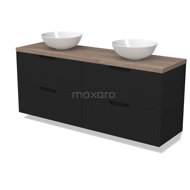 Modulo Plato Badmöbel mit Aufsatzwaschbecken | 160 cm Matt Schwarz Linie front Mittelbraune Eiche blatt 4 Schubladen