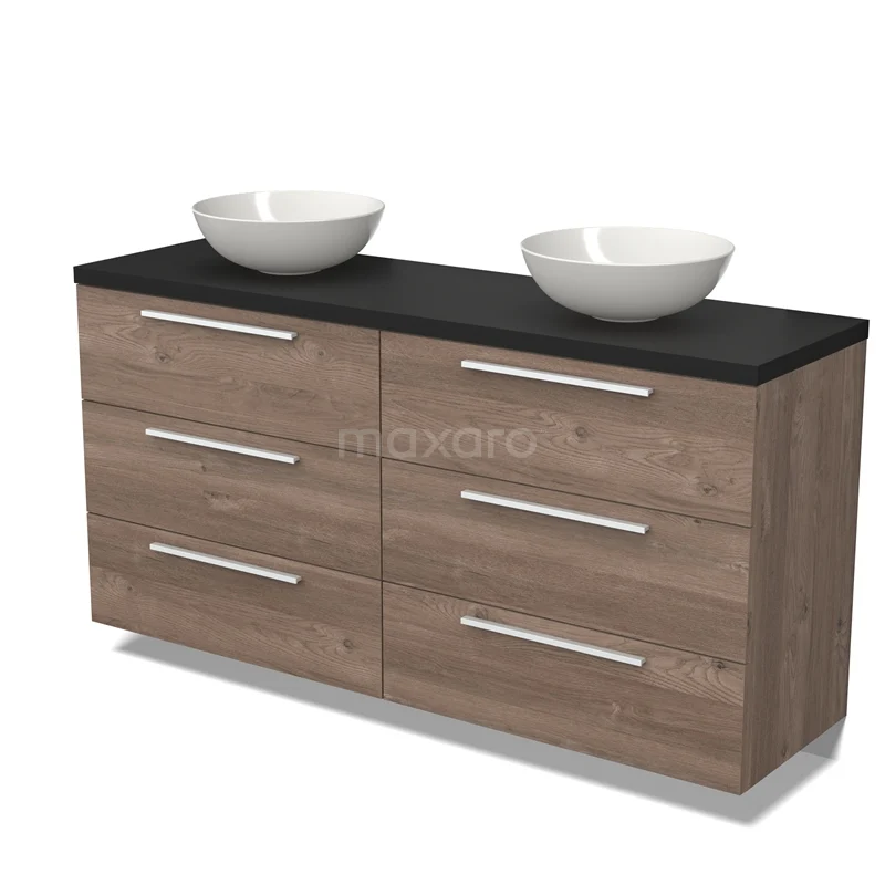 Modulo Plato Badmöbel mit Aufsatzwaschbecken | 160 cm Mittelbraune Eiche Flach front Matt Schwarz blatt 6 Schubladen
