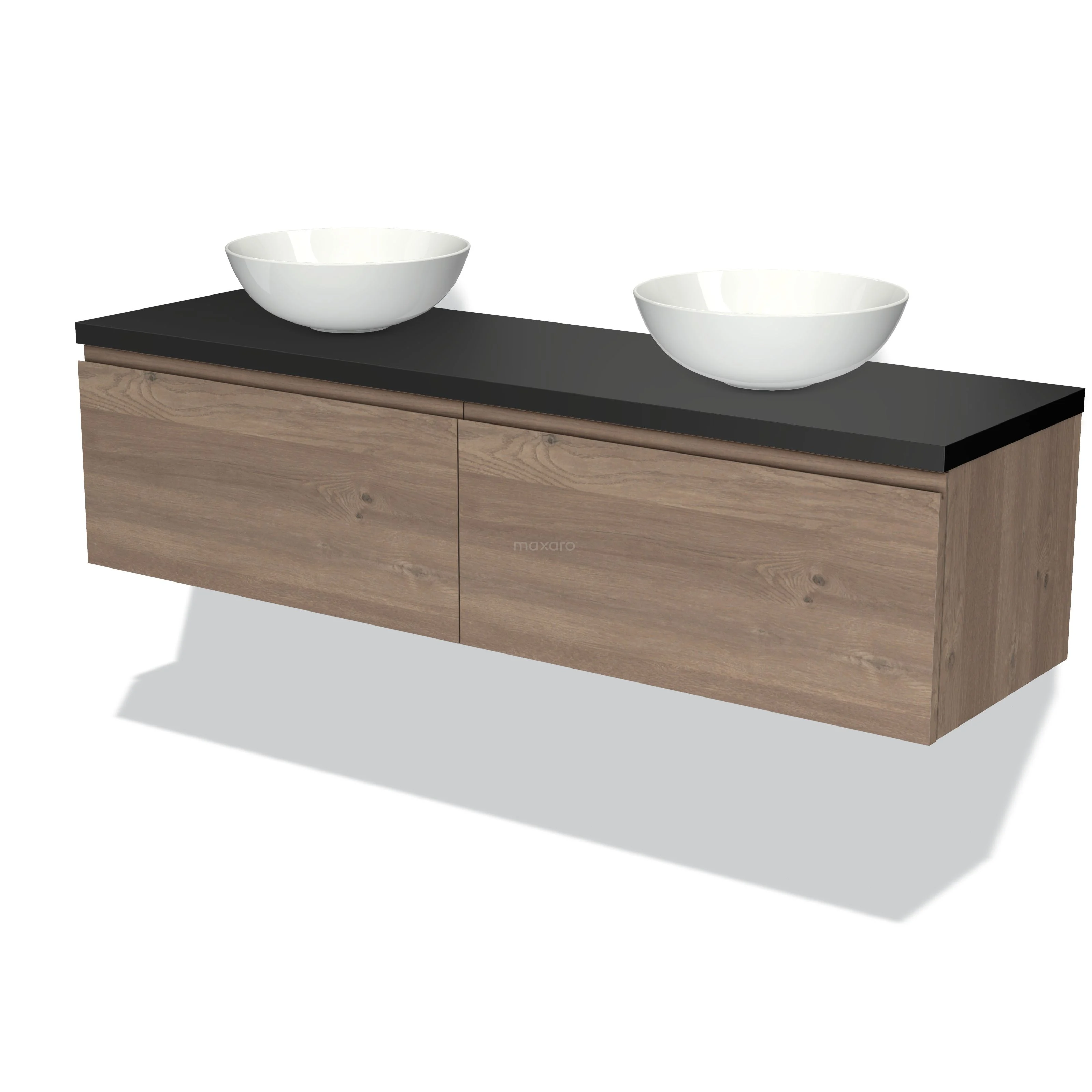 Modulo Plato Badmöbel mit Aufsatzwaschbecken | 160 cm Mittelbraune Eiche Grifflos front Matt Schwarz blatt 2 nebeneinanderliegende Schubladen