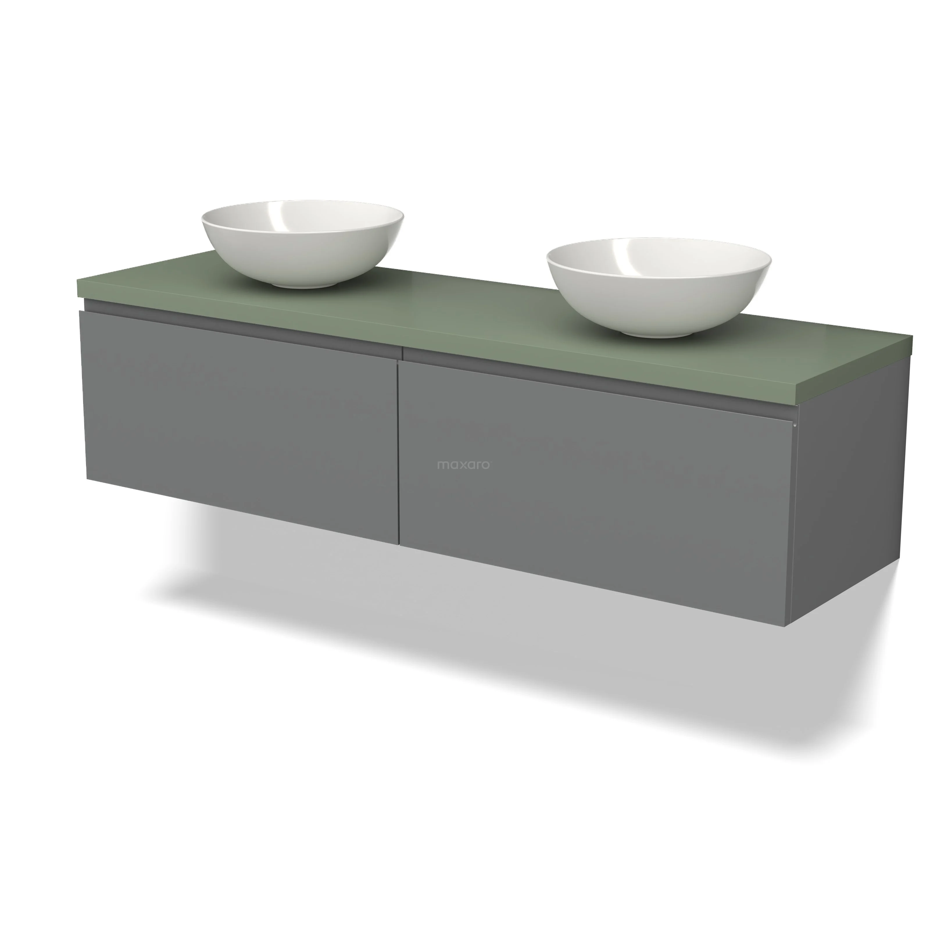Modulo Plato Badmöbel mit Aufsatzwaschbecken | 160 cm Mittelgrau Grifflos front Salbeigrün blatt 2 nebeneinanderliegende Schubladen