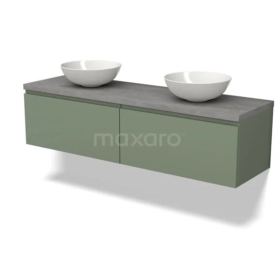 Modulo Plato Badmöbel mit Aufsatzwaschbecken | 160 cm Salbeigrün Grifflos front Hellgrauer Beton blatt 2 nebeneinanderliegende Schubladen
