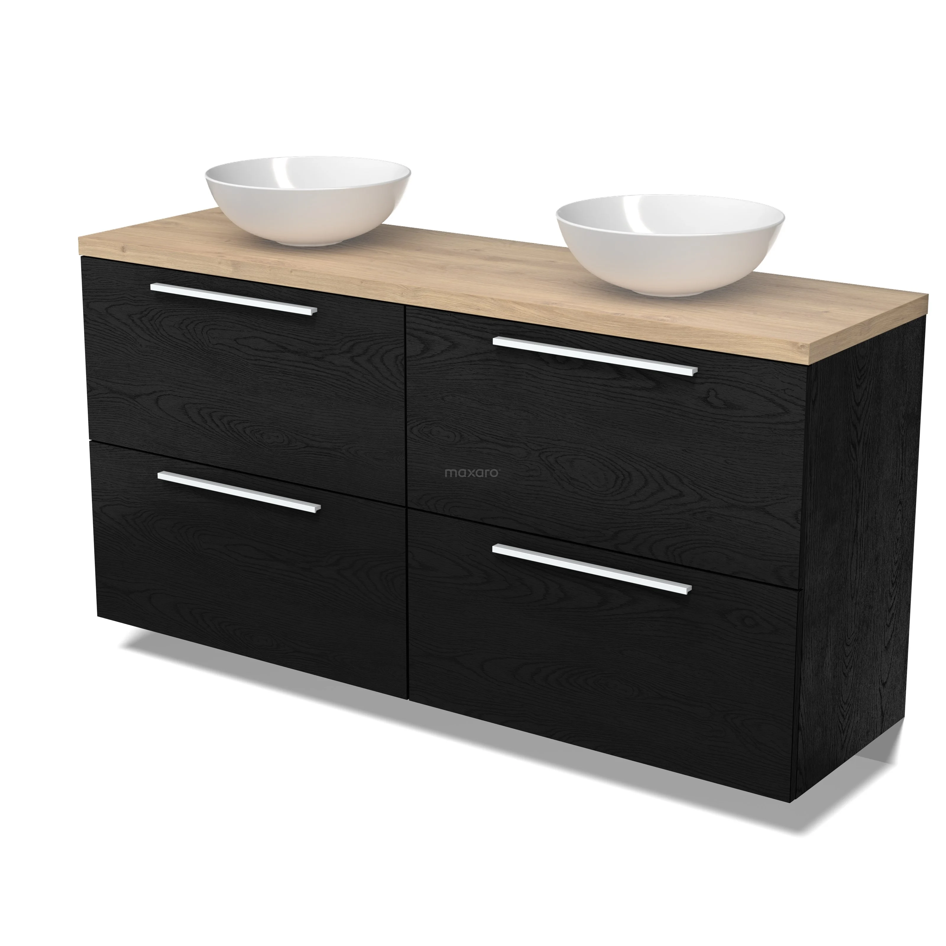 Modulo Plato Badmöbel mit Aufsatzwaschbecken | 160 cm Schwarze Eiche Flach front Hellbraune Eiche blatt 4 hohe Schubladen