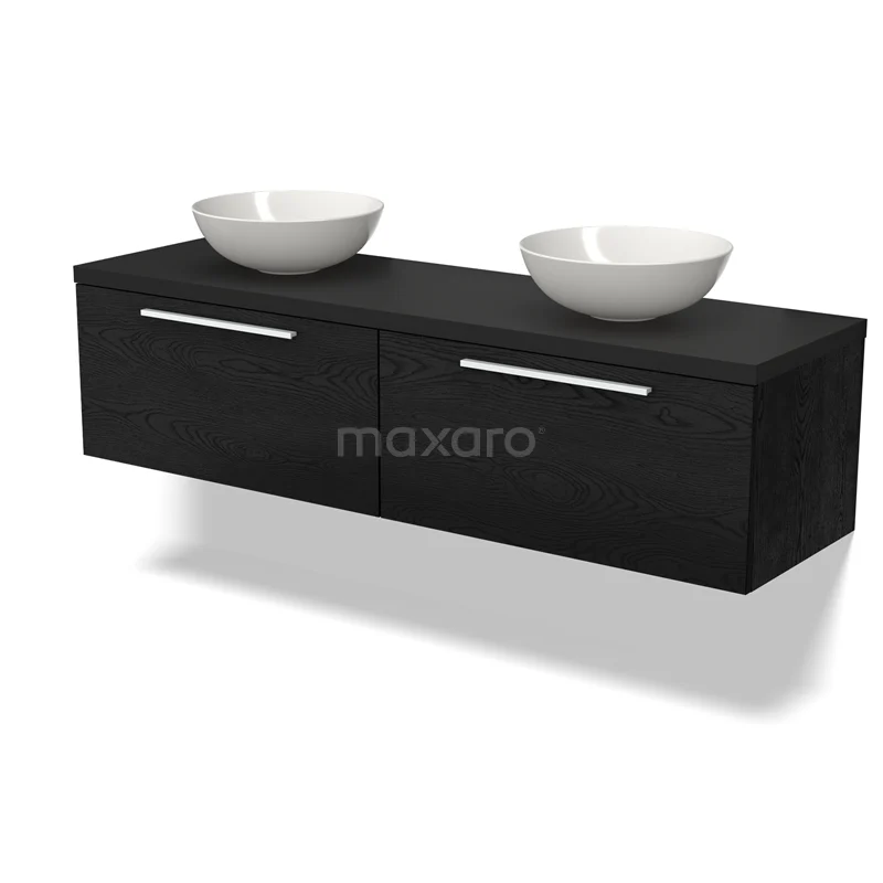 Modulo Plato Badmöbel mit Aufsatzwaschbecken | 160 cm Schwarze Eiche Flach front Matt Schwarz blatt 2 nebeneinanderliegende Schubladen