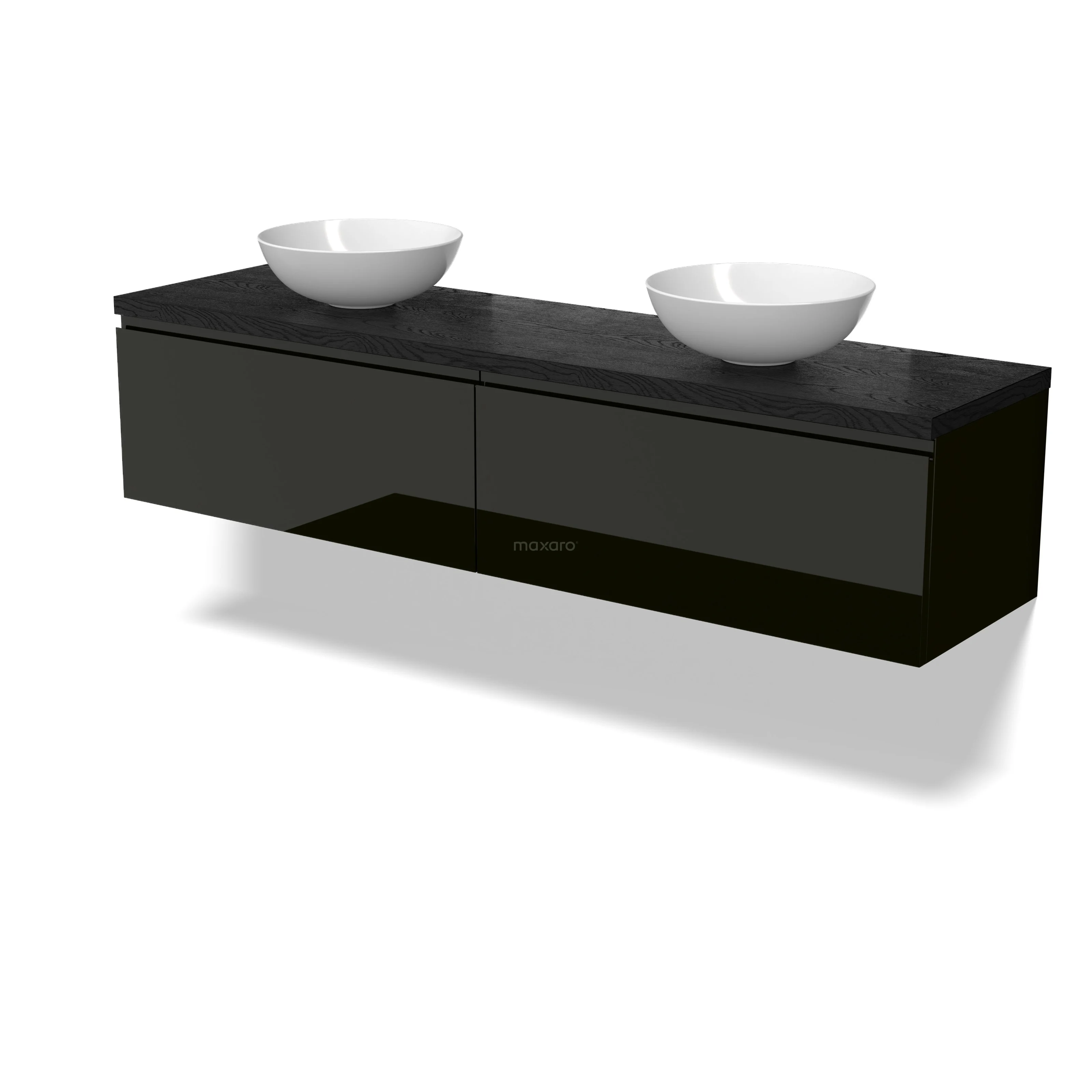 Modulo Plato Badmöbel mit Aufsatzwaschbecken | 180 cm Hochglanz Schwarz Grifflos front Schwarze Eiche blatt 2 nebeneinanderliegende Schubladen