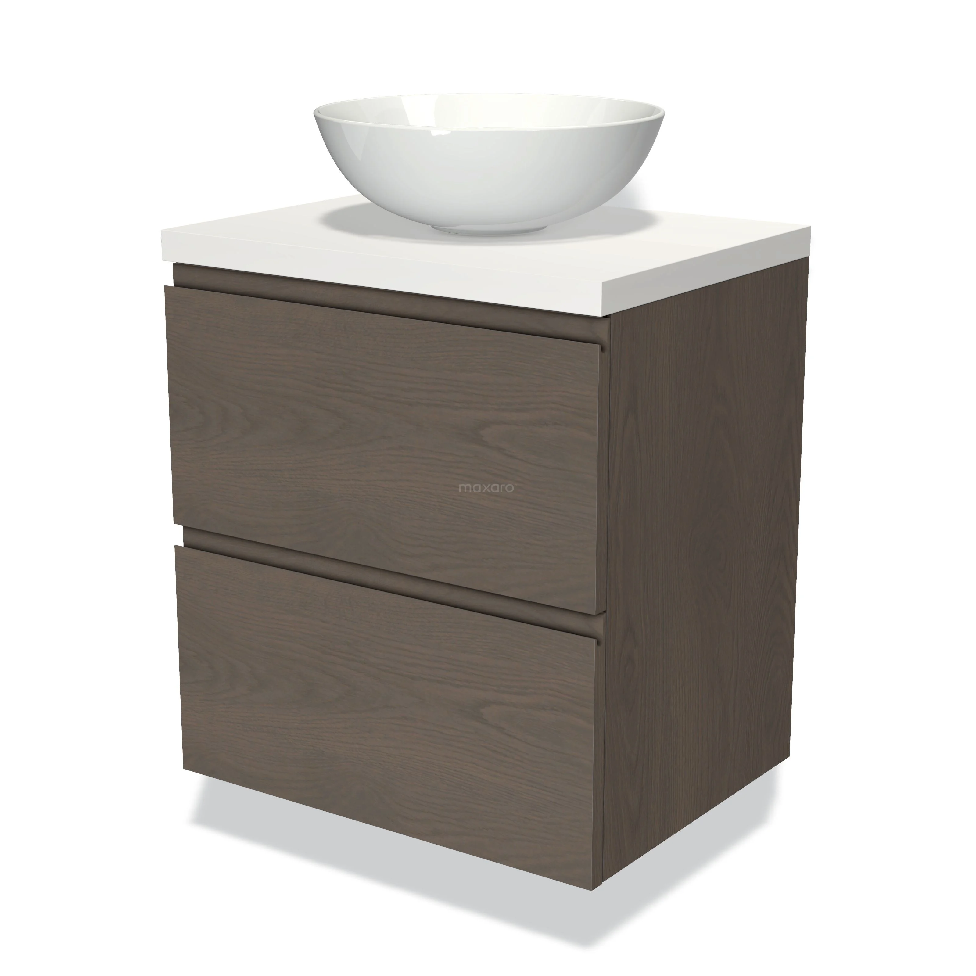 Modulo Plato Badmöbel mit Aufsatzwaschbecken | 60 cm Dunkelbraune Eiche Grifflos front Matt Weiß blatt 2 übereinanderliegende Schubladen