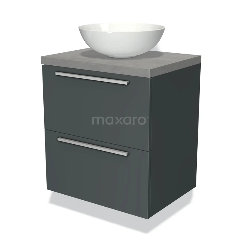 Modulo Plato Badmöbel mit Aufsatzwaschbecken | 60 cm Dunkelgrau Flach front Hellgrauer Beton blatt 2 übereinanderliegende Schubladen