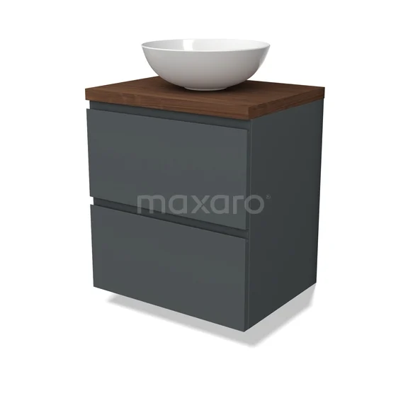 Modulo Plato Badmöbel mit Aufsatzwaschbecken | 60 cm Dunkelgrau Grifflos front Walnuss blatt 2 übereinanderliegende Schubladen