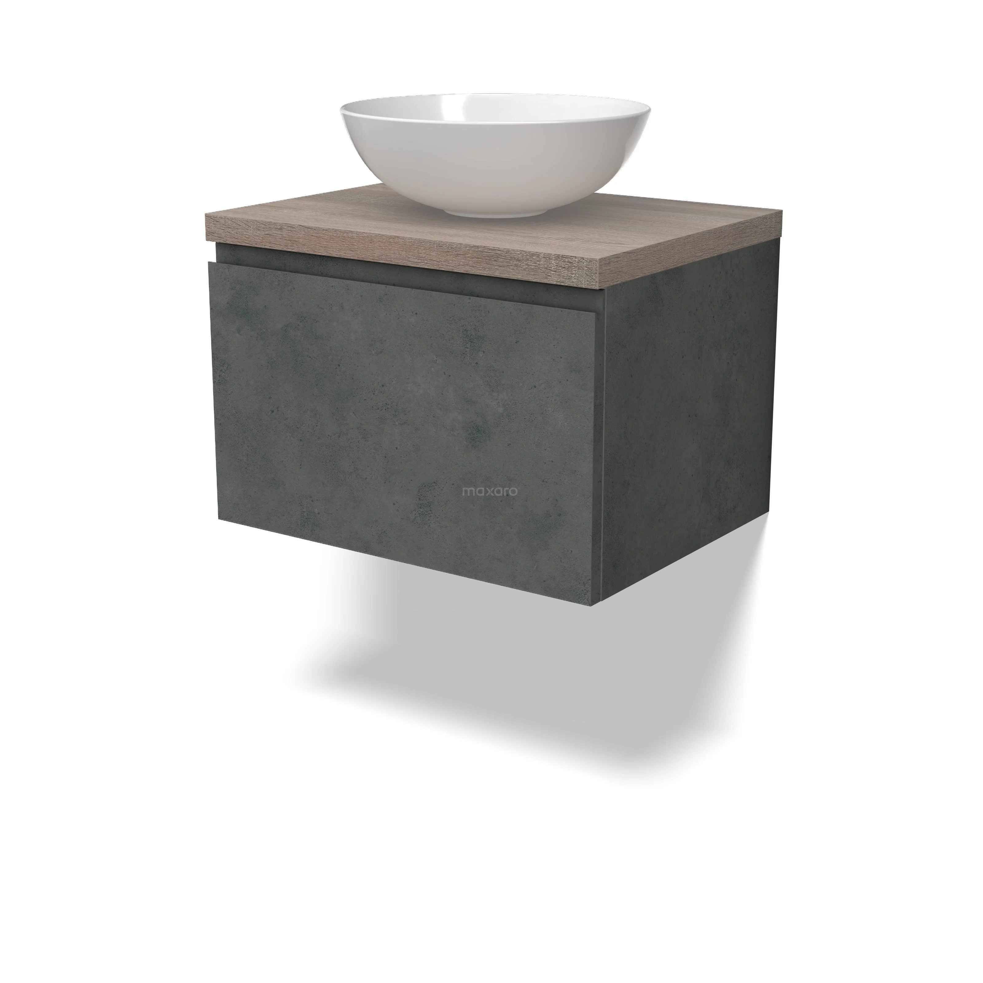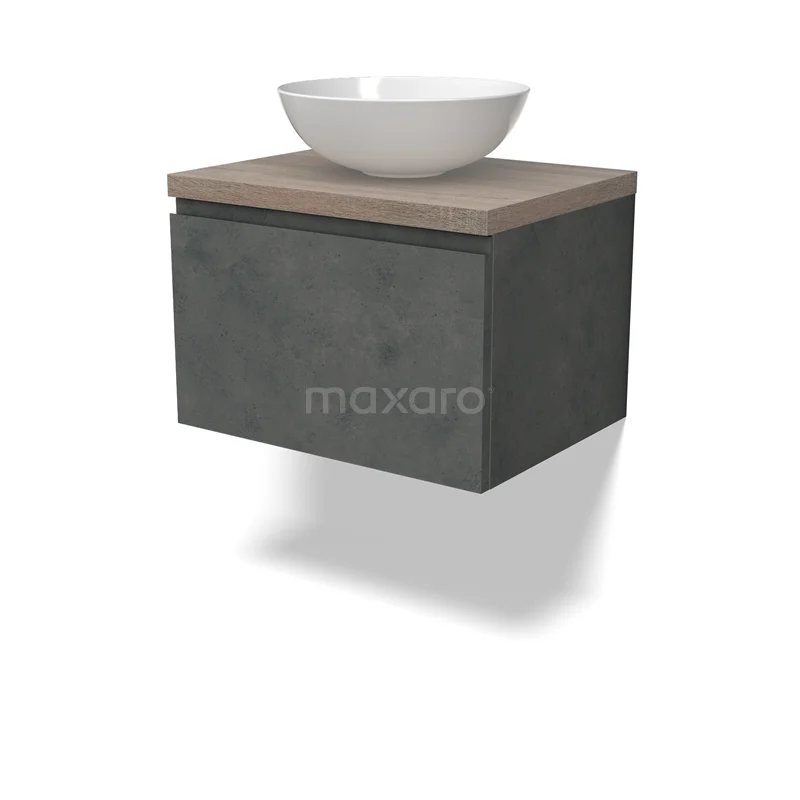 Modulo Plato Badmöbel mit Aufsatzwaschbecken | 60 cm Dunkelgrauer Beton Grifflos front Eiche blatt 1 Schublade