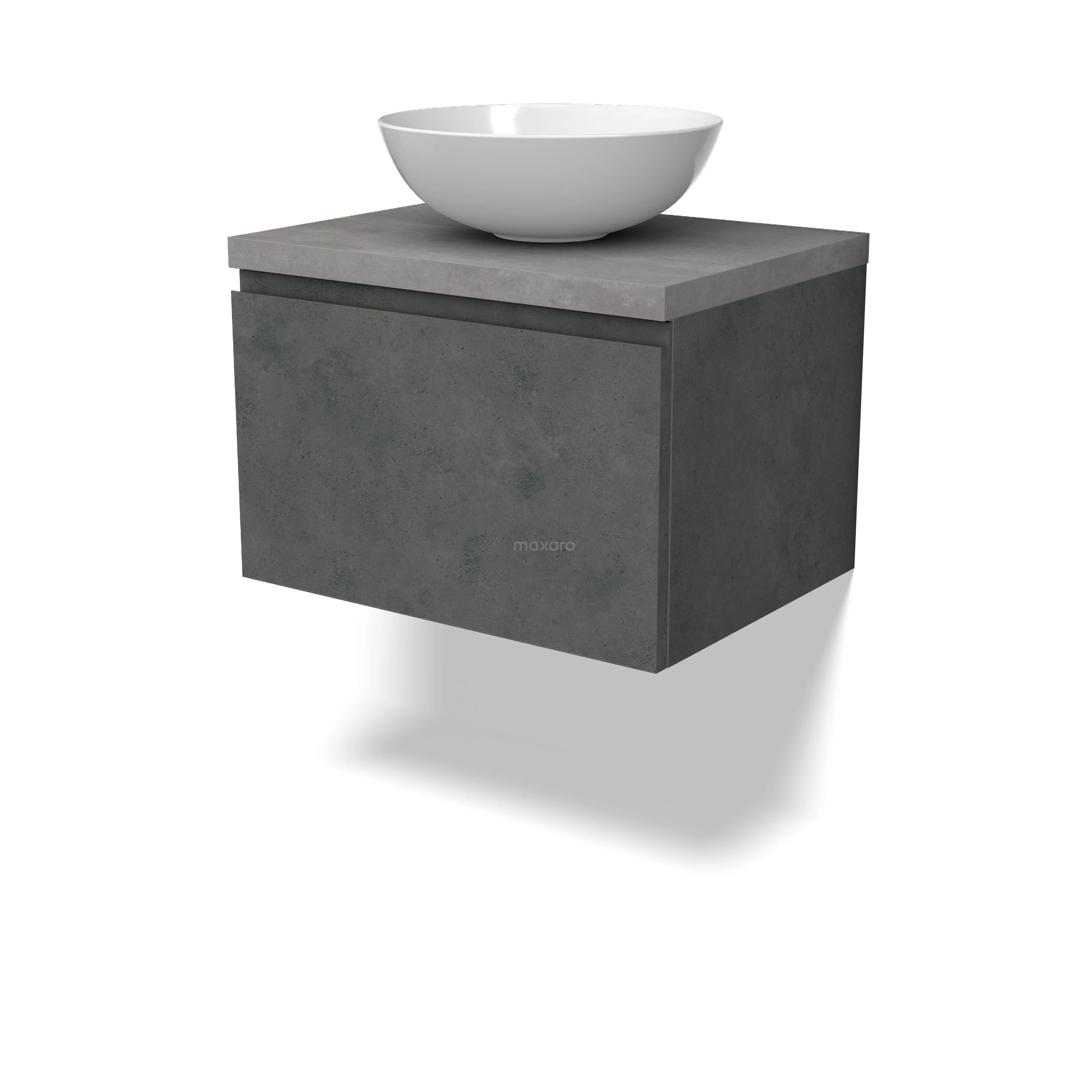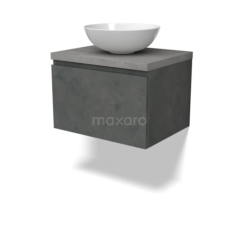 Modulo Plato Badmöbel mit Aufsatzwaschbecken | 60 cm Dunkelgrauer Beton Grifflos front Hellgrauer Beton blatt 1 Schublade