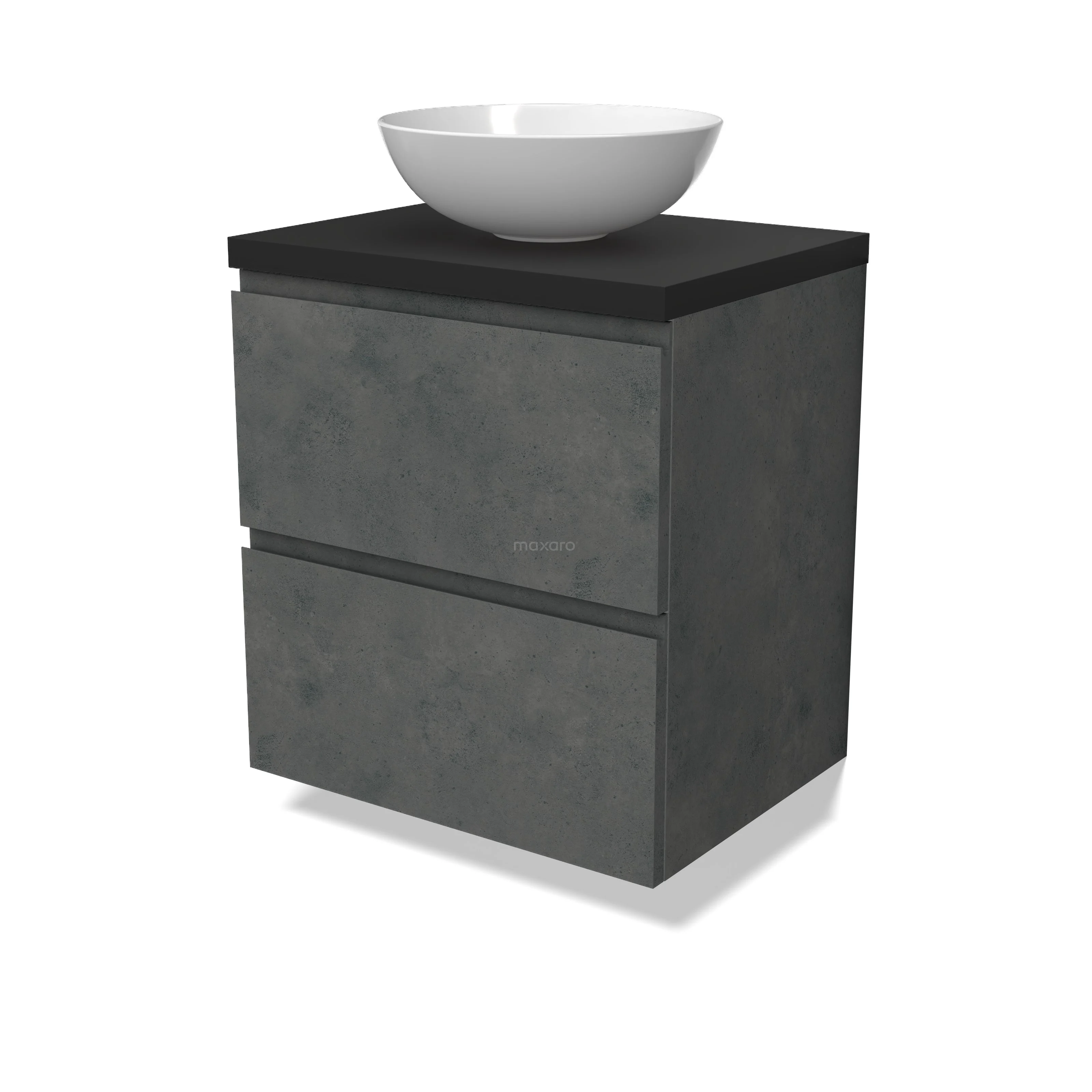 Modulo Plato Badmöbel mit Aufsatzwaschbecken | 60 cm Dunkelgrauer Beton Grifflos front Matt Schwarz blatt 2 übereinanderliegende Schubladen