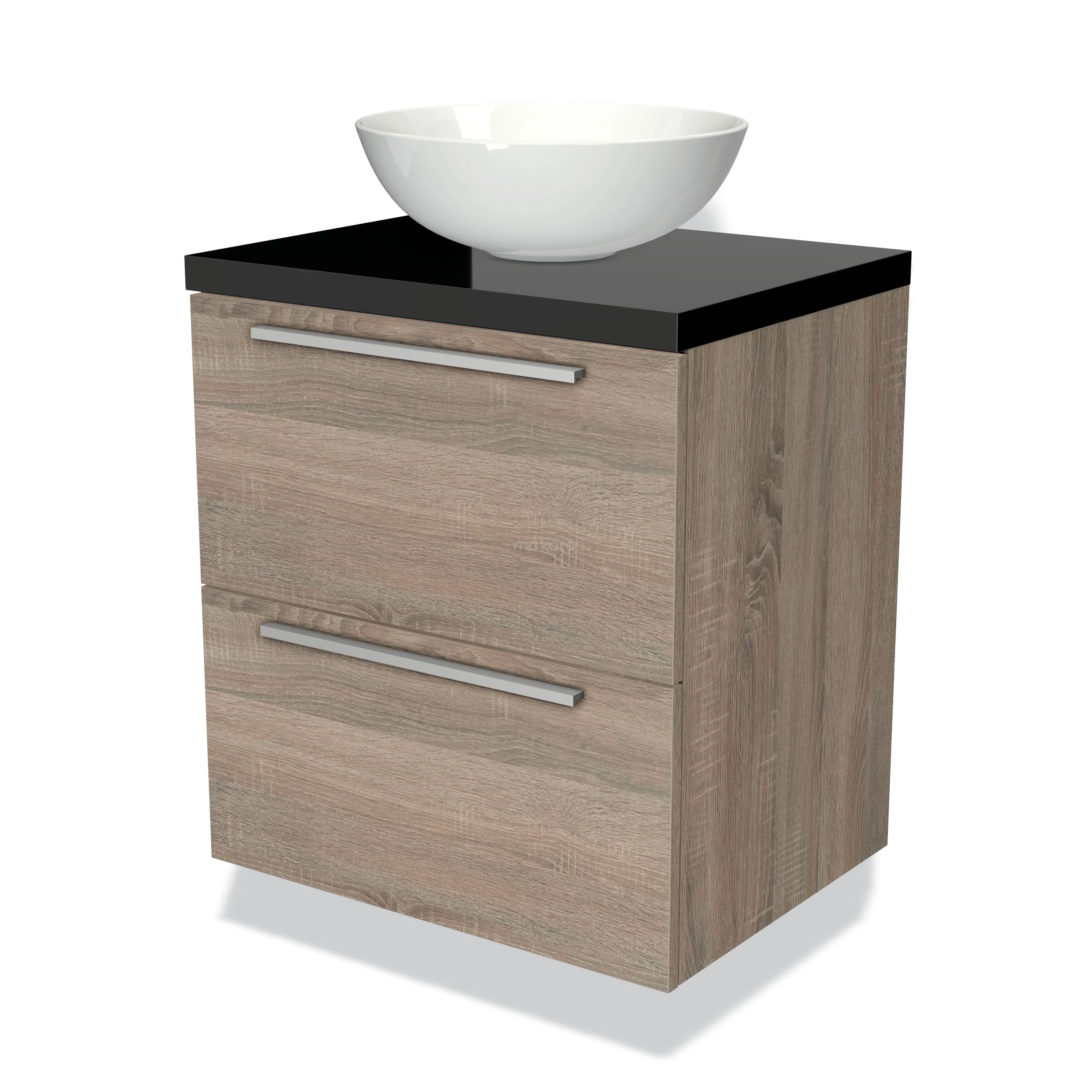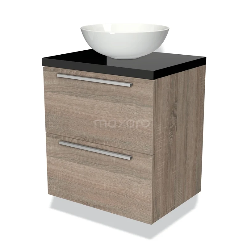 Modulo Plato Badmöbel mit Aufsatzwaschbecken | 60 cm Eiche Flach front Hochglanz Schwarz blatt 2 übereinanderliegende Schubladen