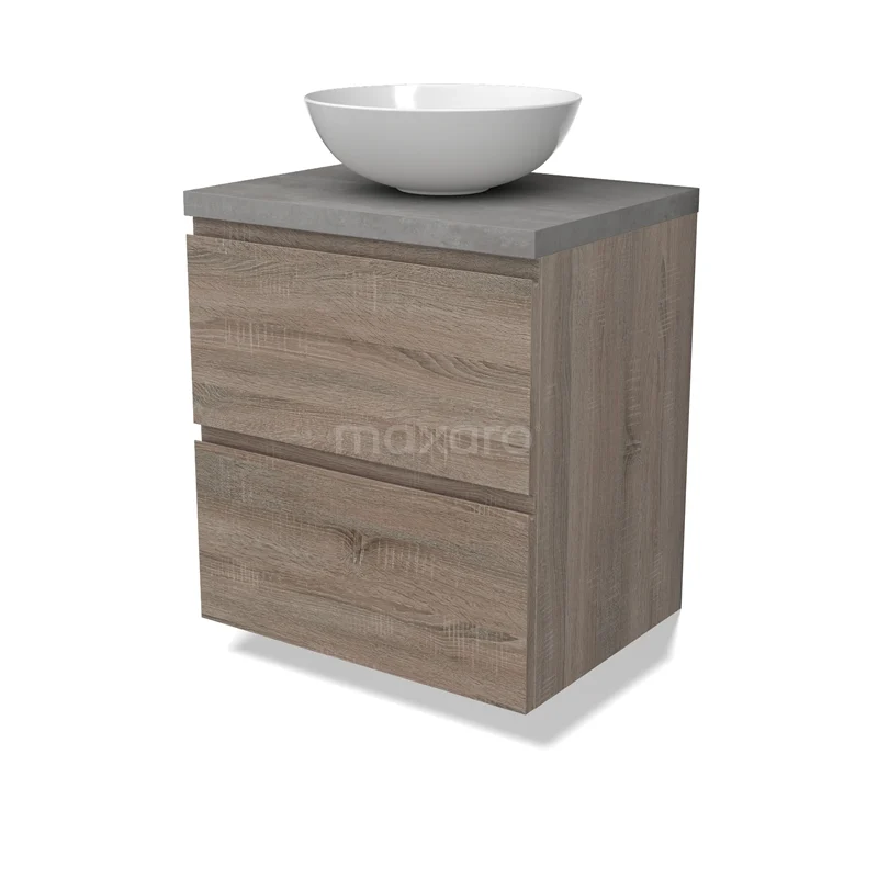 Modulo Plato Badmöbel mit Aufsatzwaschbecken | 60 cm Eiche Grifflos front Hellgrauer Beton blatt 2 übereinanderliegende Schubladen