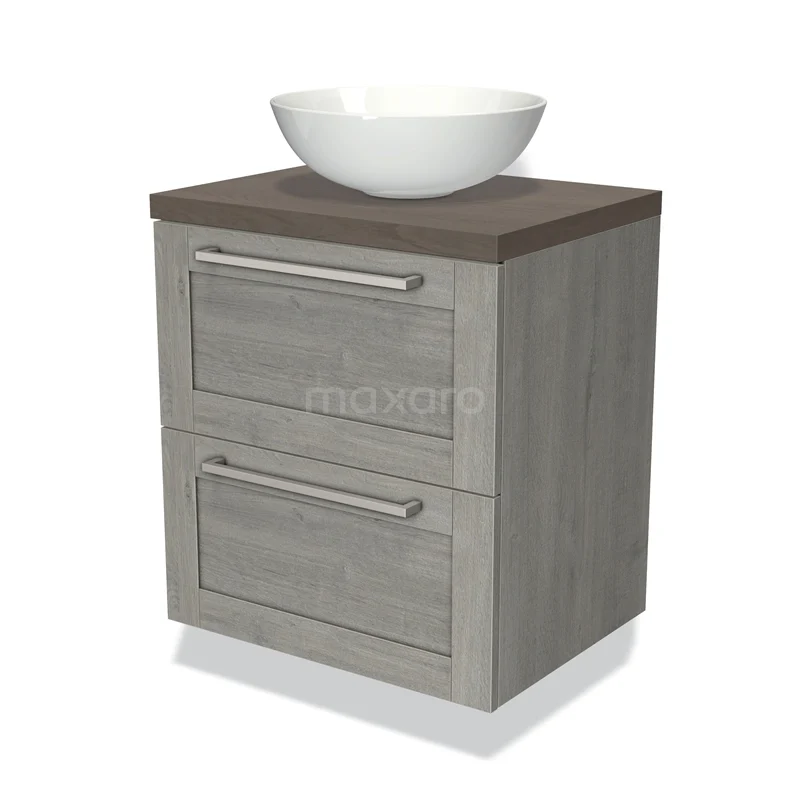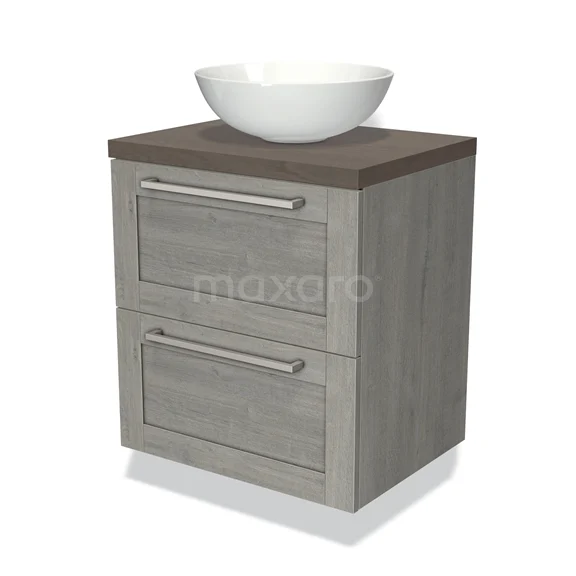 Modulo Plato Badmöbel mit Aufsatzwaschbecken | 60 cm Graue Eiche Rahmen front Dunkelbraune Eiche blatt 2 übereinanderliegende Schubladen