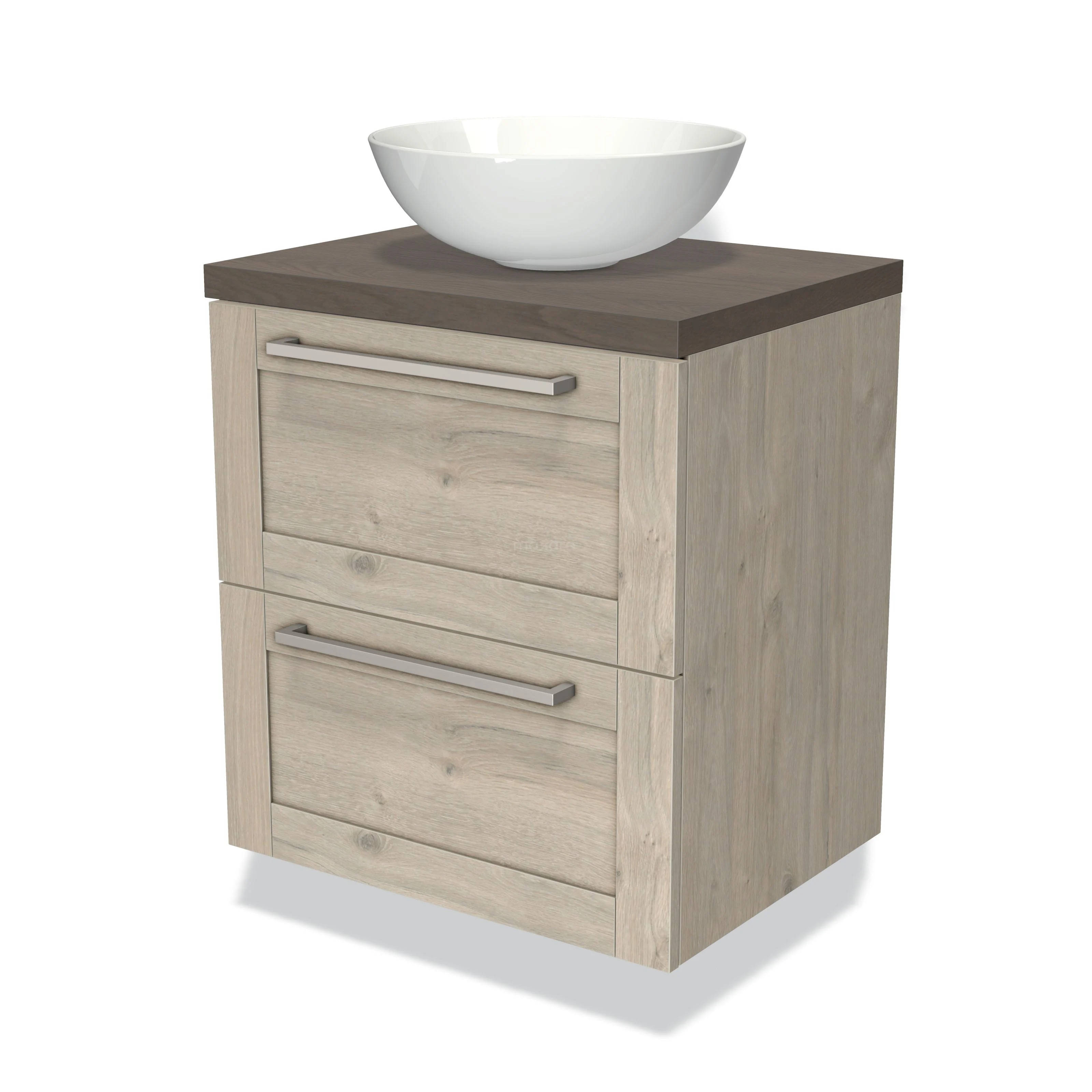 Modulo Plato Badmöbel mit Aufsatzwaschbecken | 60 cm Hellgraue Eiche Rahmen front Dunkelbraune Eiche blatt 2 übereinanderliegende Schubladen