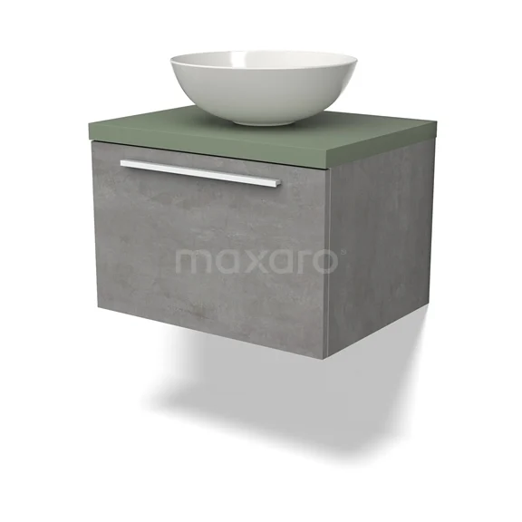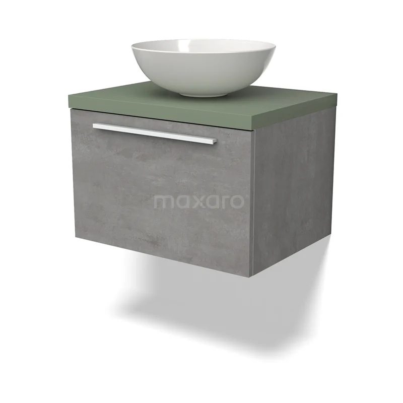 Modulo Plato Badmöbel mit Aufsatzwaschbecken | 60 cm Hellgrauer Beton Flach front Salbeigrün blatt 1 Schublade