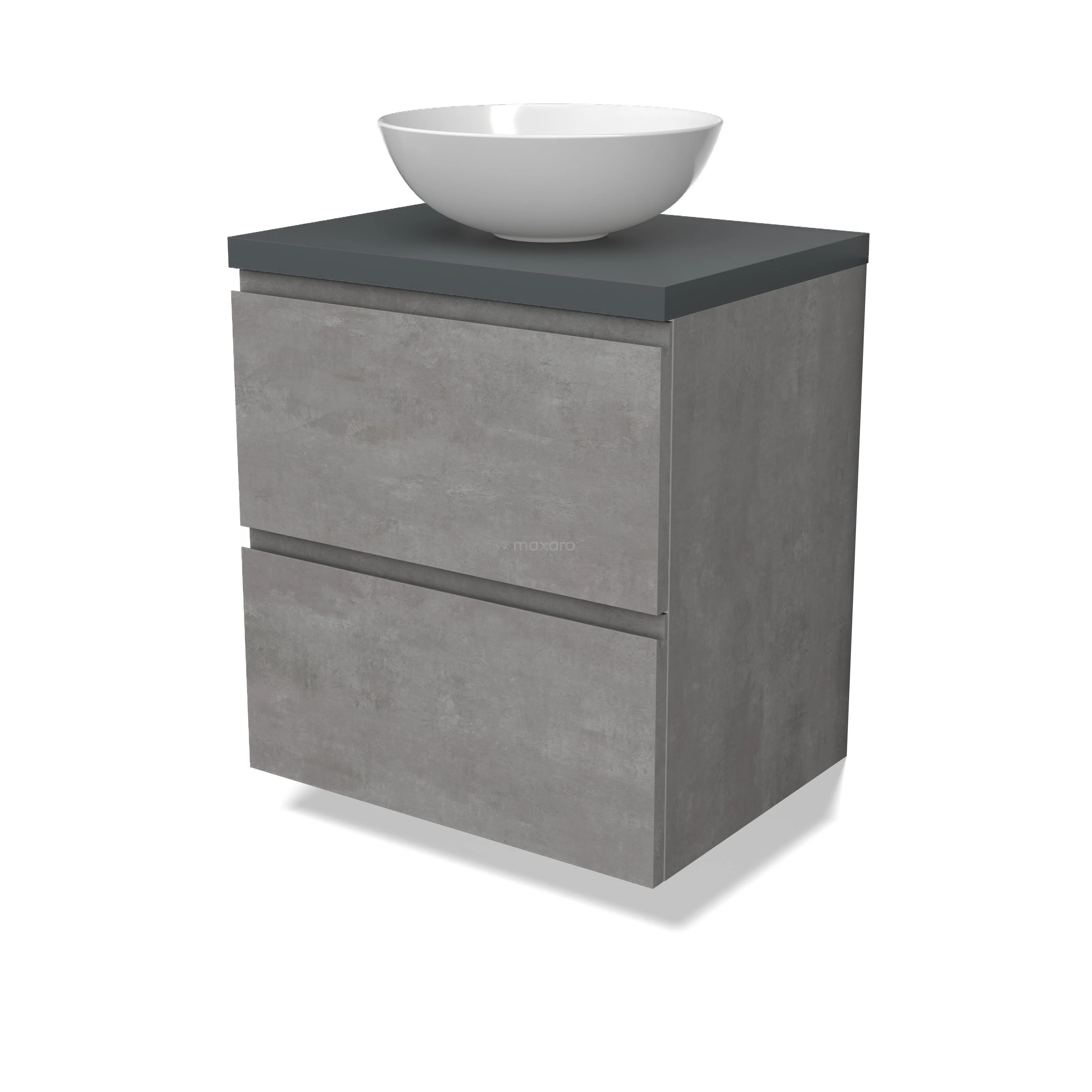Modulo Plato Badmöbel mit Aufsatzwaschbecken | 60 cm Hellgrauer Beton Grifflos front Dunkelgrau blatt 2 übereinanderliegende Schubladen
