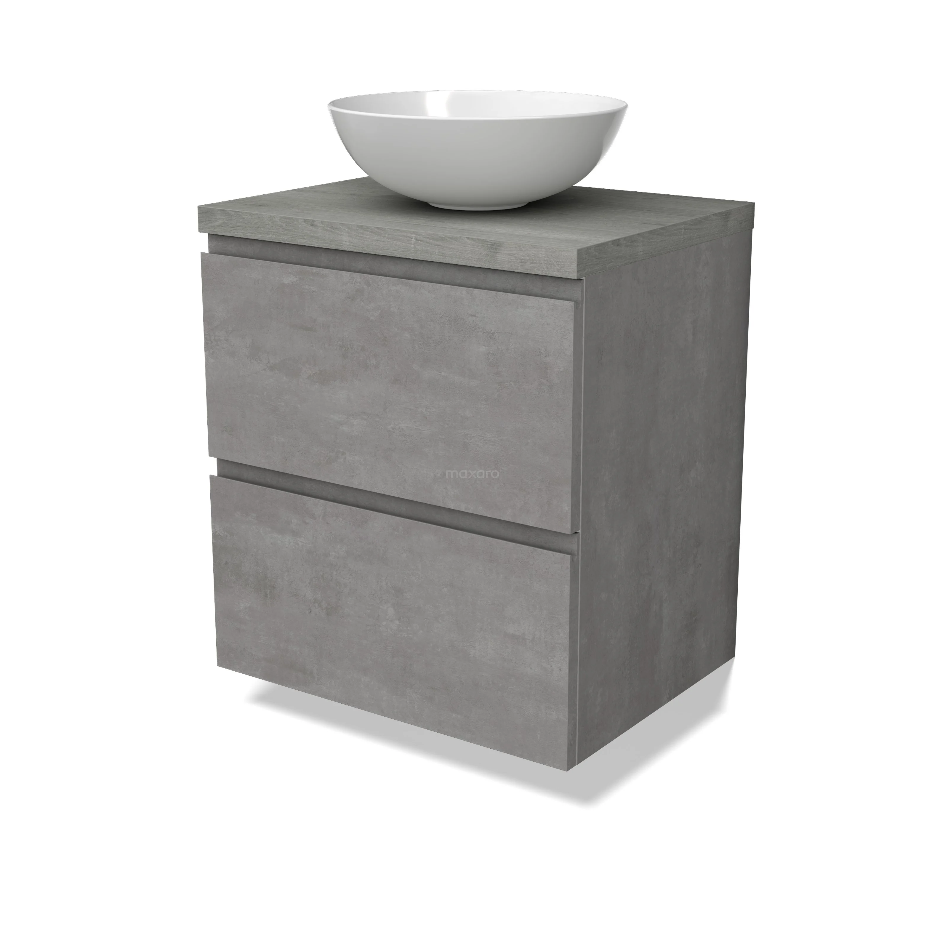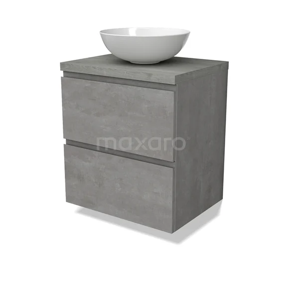 Modulo Plato Badmöbel mit Aufsatzwaschbecken | 60 cm Hellgrauer Beton Grifflos front Graue Eiche blatt 2 übereinanderliegende Schubladen BMK17-02847