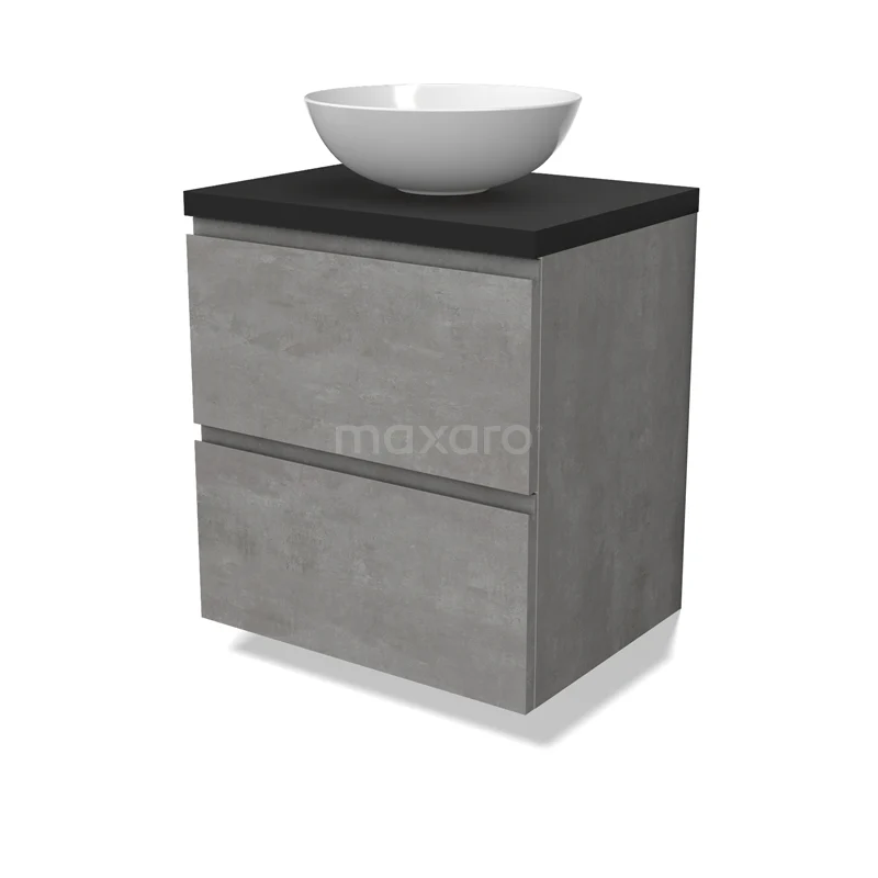 Modulo Plato Badmöbel mit Aufsatzwaschbecken | 60 cm Hellgrauer Beton Grifflos front Matt Schwarz blatt 2 übereinanderliegende Schubladen BMK17-02833