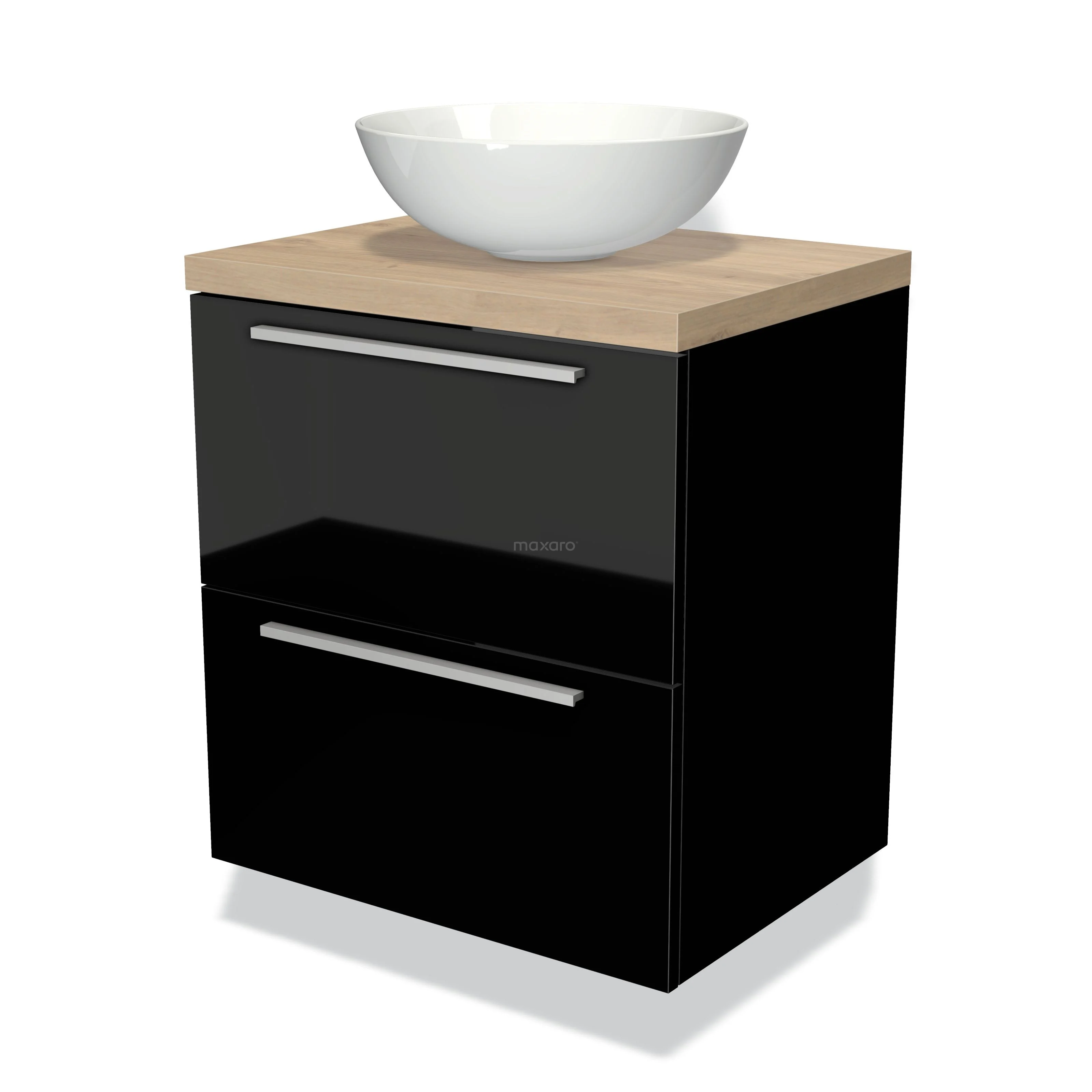 Modulo Plato Badmöbel mit Aufsatzwaschbecken | 60 cm Hochglanz Schwarz Flach front Hellbraune Eiche blatt 2 übereinanderliegende Schubladen