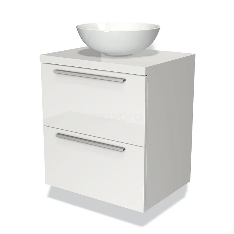 Modulo Plato Badmöbel mit Aufsatzwaschbecken | 60 cm Hochglanz Weiß Flach front Hochglanz Weiß blatt 2 übereinanderliegende Schubladen