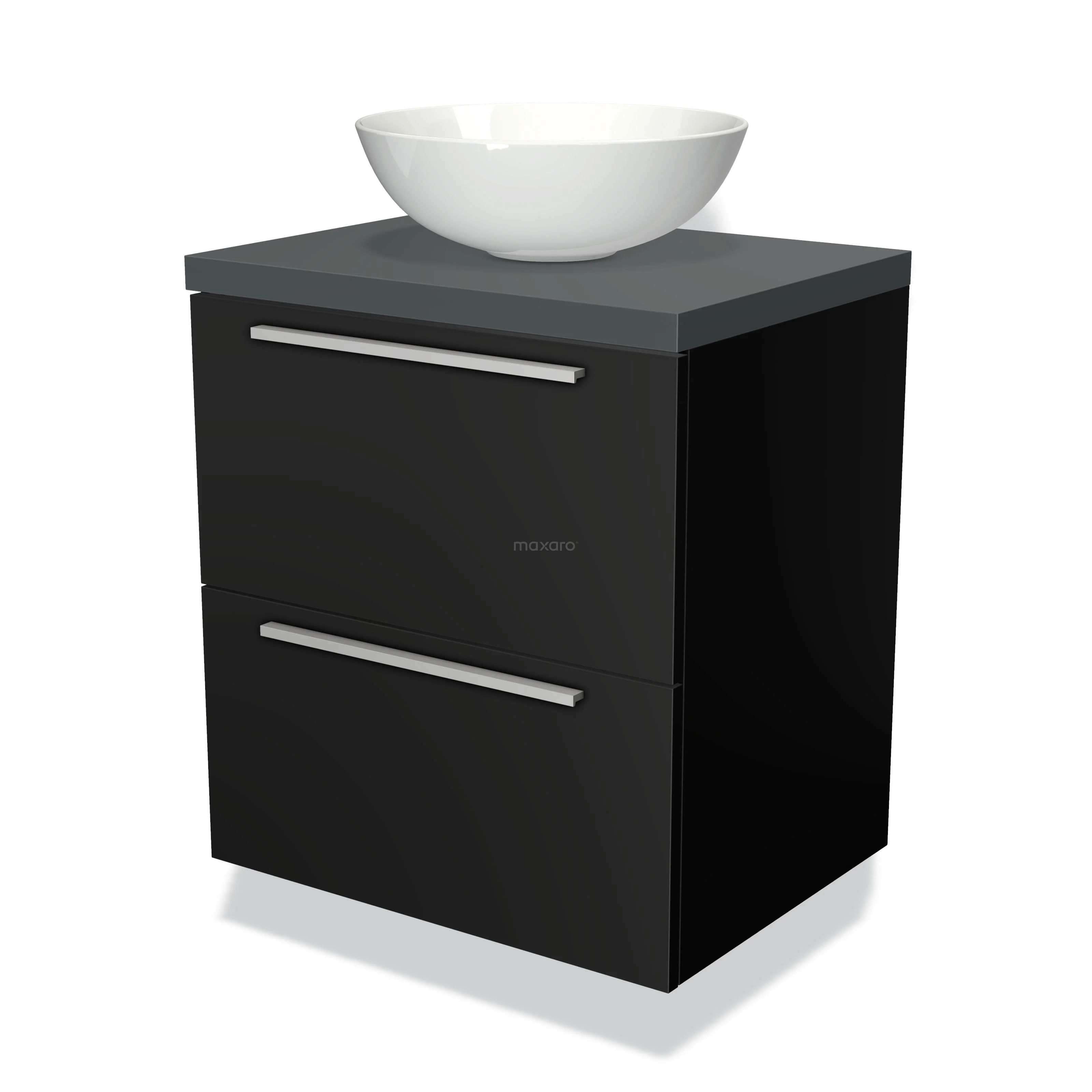 Modulo Plato Badmöbel mit Aufsatzwaschbecken | 60 cm Matt Schwarz Flach front Dunkelgrau blatt 2 übereinanderliegende Schubladen