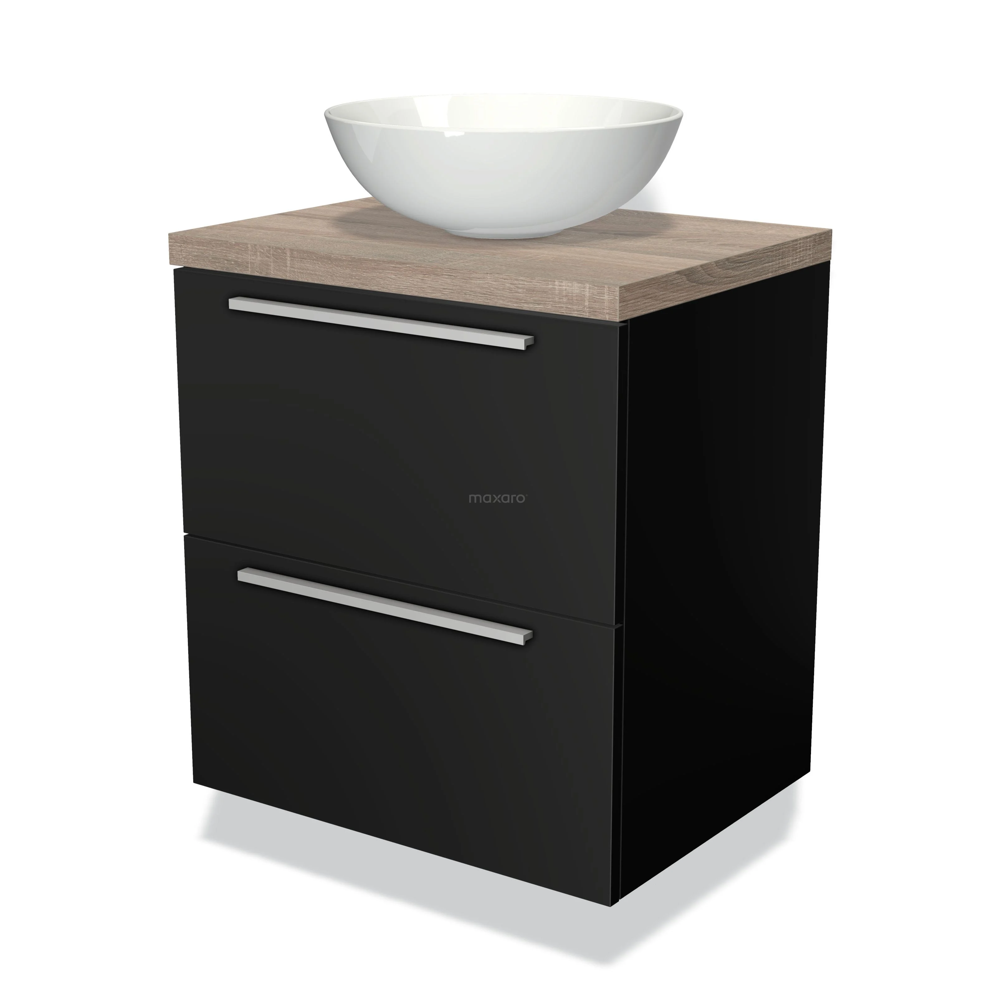 Modulo Plato Badmöbel mit Aufsatzwaschbecken | 60 cm Matt Schwarz Flach front Eiche blatt 2 übereinanderliegende Schubladen