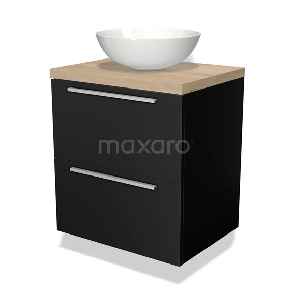 Modulo Plato Badmöbel mit Aufsatzwaschbecken | 60 cm Matt Schwarz Flach front Hellbraune Eiche blatt 2 übereinanderliegende Schubladen