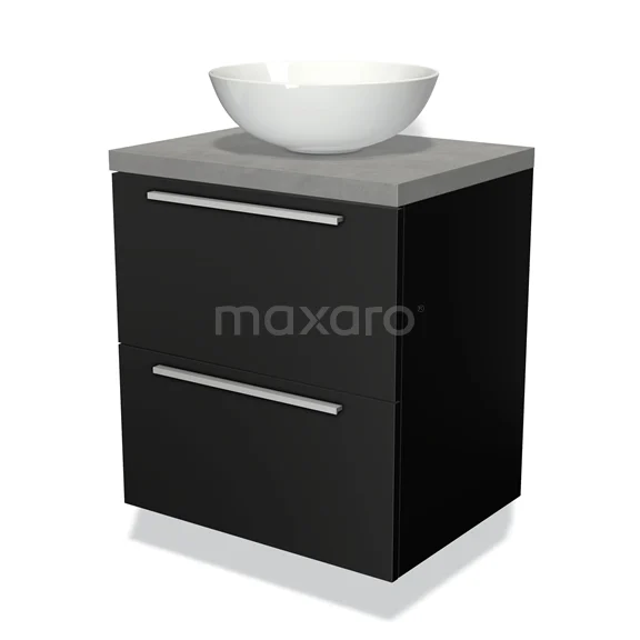 Modulo Plato Badmöbel mit Aufsatzwaschbecken | 60 cm Matt Schwarz Flach front Hellgrauer Beton blatt 2 übereinanderliegende Schubladen