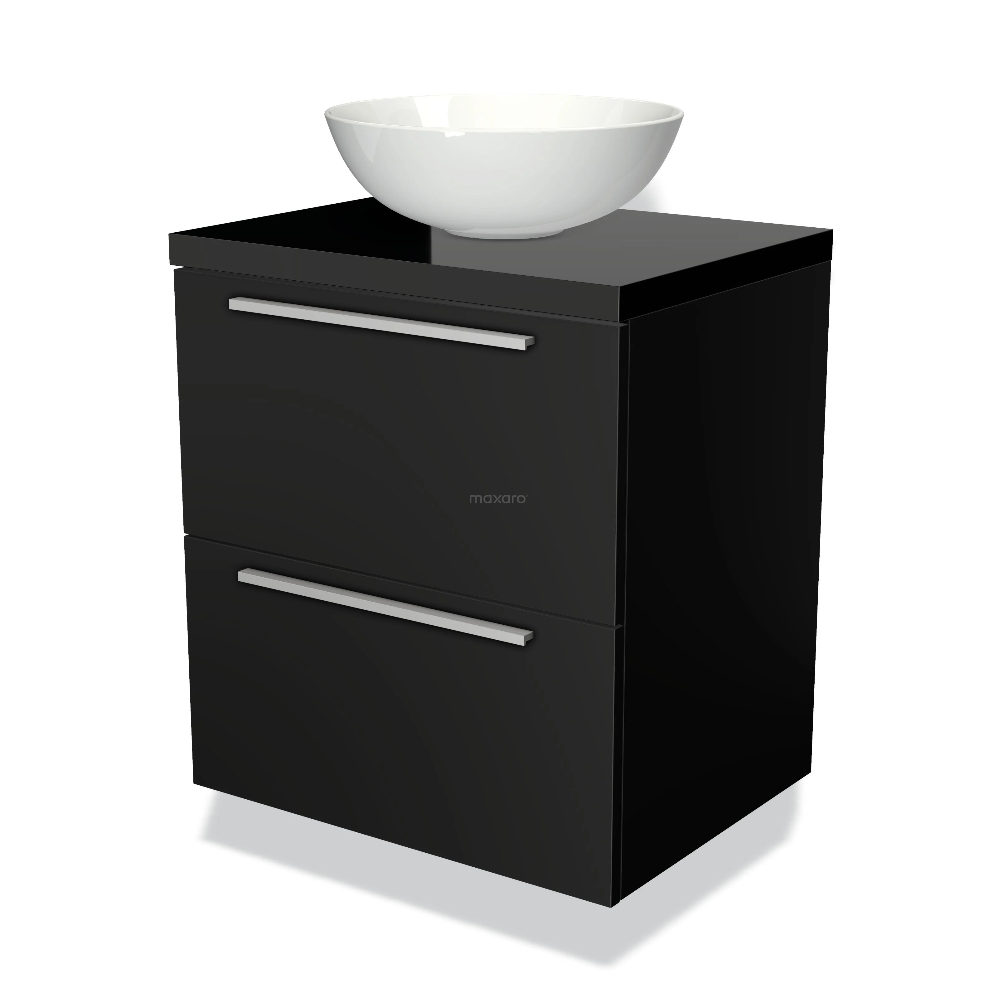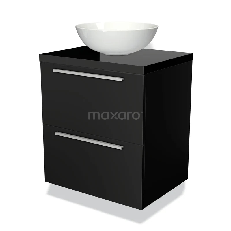 Modulo Plato Badmöbel mit Aufsatzwaschbecken | 60 cm Matt Schwarz Flach front Hochglanz Schwarz blatt 2 übereinanderliegende Schubladen