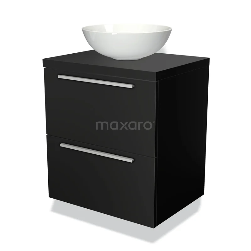 Modulo Plato Badmöbel mit Aufsatzwaschbecken | 60 cm Matt Schwarz Flach front Matt Schwarz blatt 2 übereinanderliegende Schubladen